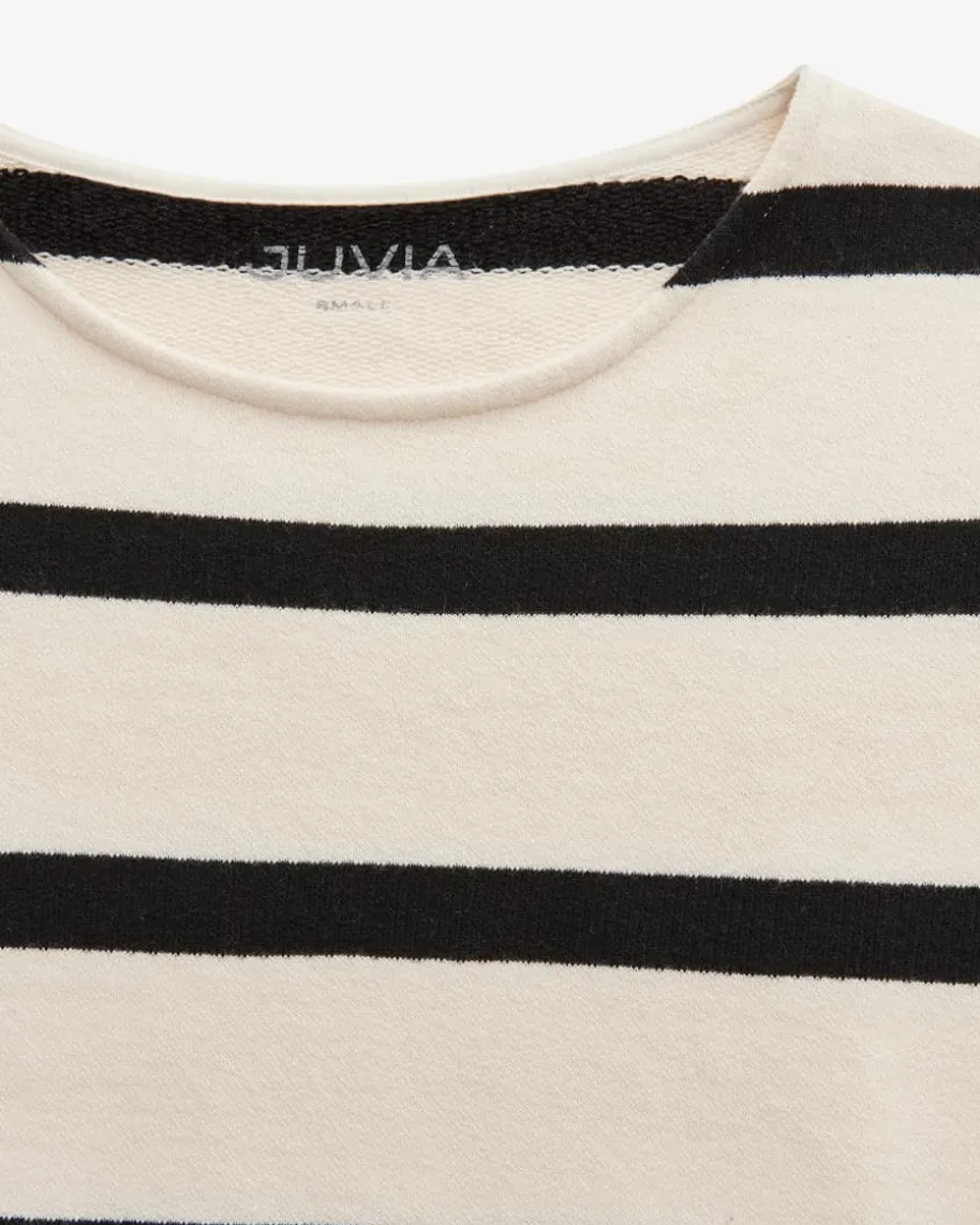 Agatha Sweatshirt für Damen von Juvia in Ecru und Schwarz. Das Casual Modell inlockerer Passform punktet dank hochwertiger, weicher Baumwolle in Strick-Optikmit optischen wie haptischen Highlights, während das Streifenmuster einenmodischen Favoriten für vielseitige Looks schafft.