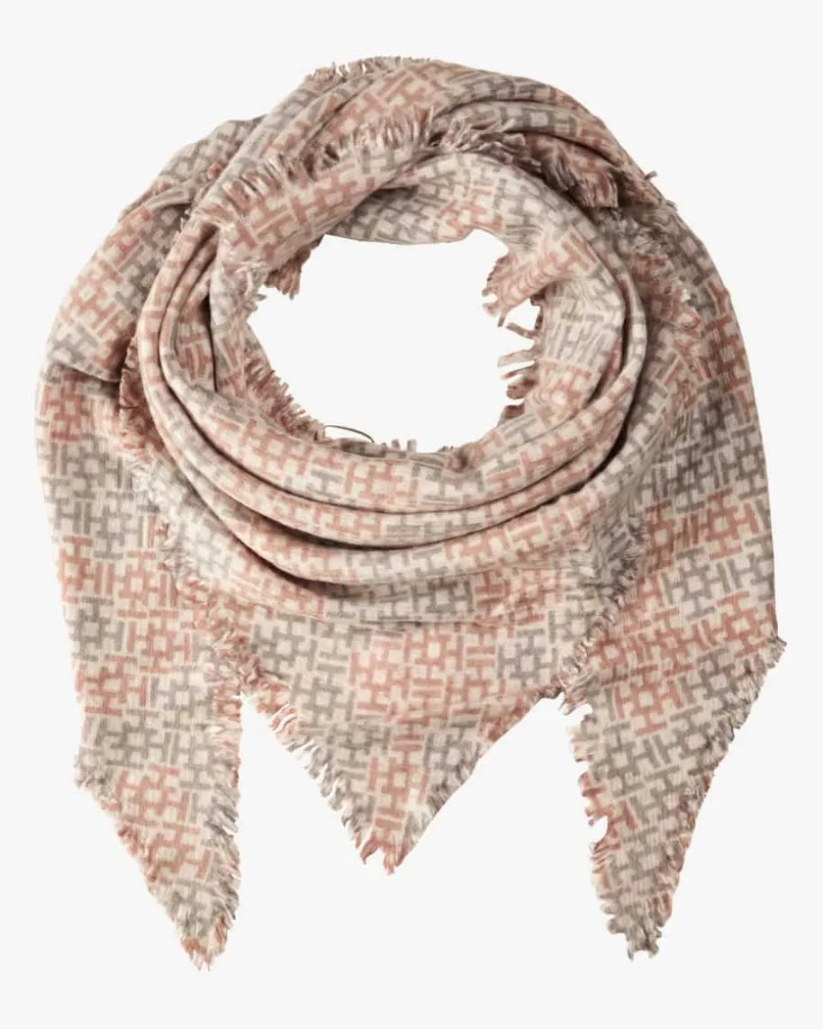 Alikibi-Tri Cashmere-Tuch für Damen von Hemisphere in Camel, Grau und Creme. Derdreieckige Schal aus hochwertiger Cashmere-Wolle punktet mit einem weichenGriff, während das Monogramm-Muster ein stilvolles Accessoire kreiert, welcheszugleich als Cape getragen werden kann.