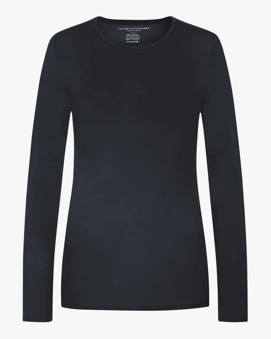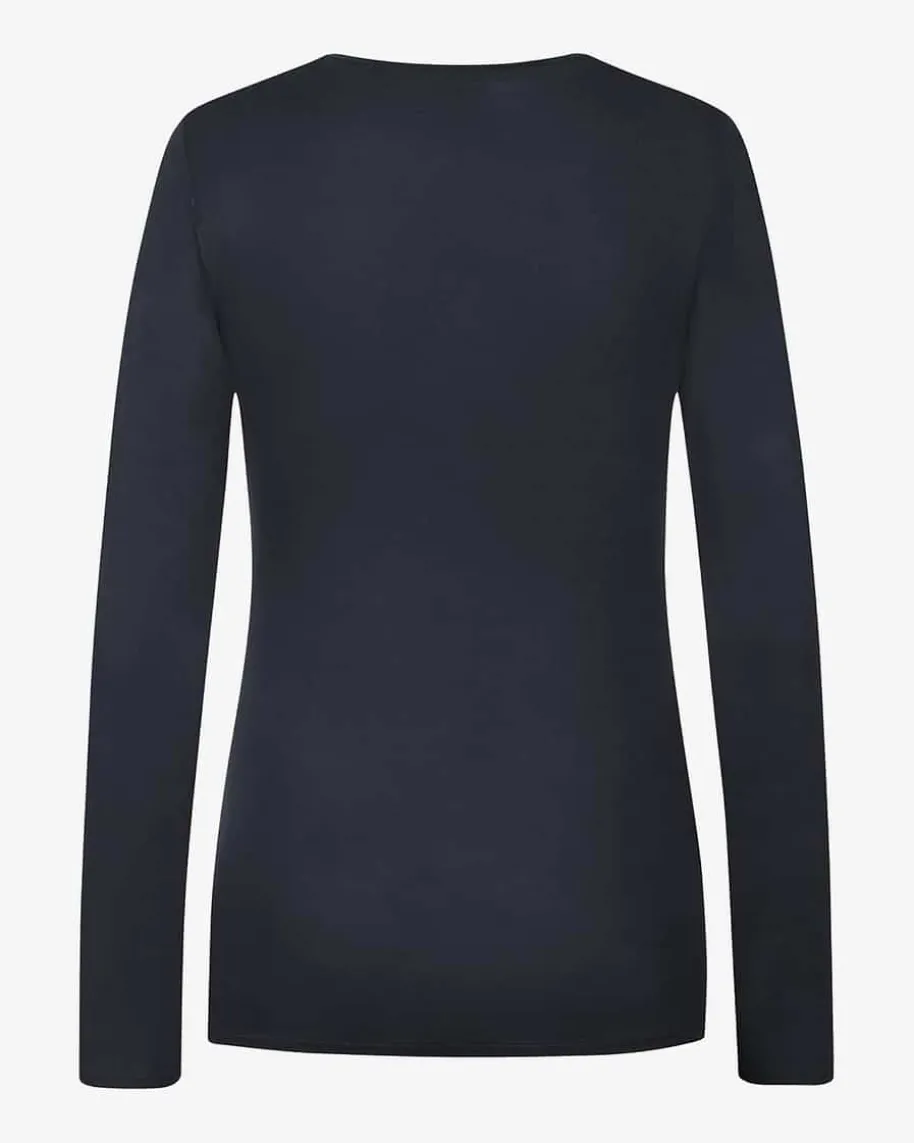 Ally Longsleeve für Damen von Majestic Filatures in Navy. Ein perfektes Basic -Dasleicht taillierte Modell überzeugt dank dem elastischen Material-Mix und derweichen Soft-Touch-Qualität mit hohem Tragekomfort.