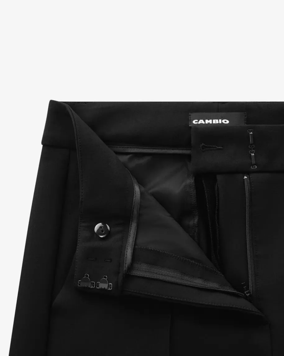Amelie Hose Fashion Fit für Damen von Cambio in Schwarz. Das Modell überzeugtdurch den festen Material-Mix mit Stretch-Anteil mit hohem Tragekomfort, währenddie ausgestellte Passform sowie klassisch-elegante Details wie die abgenähtenBügelfalten einen femininen Power-Look schaffen.