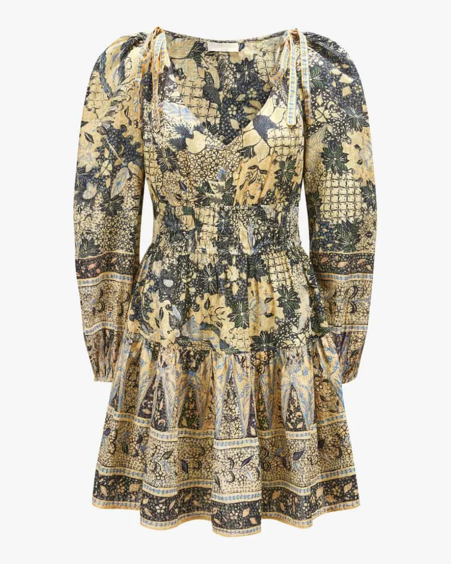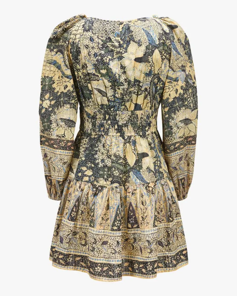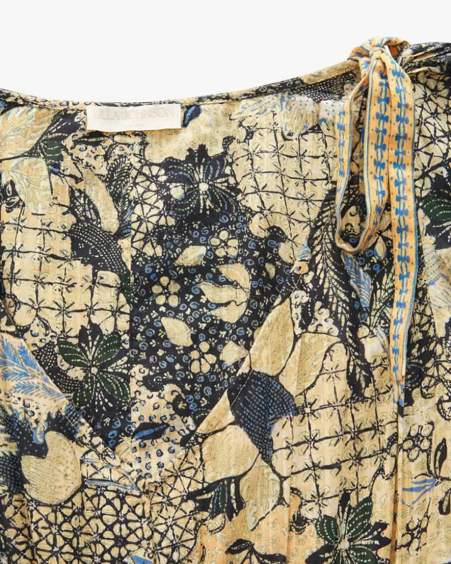 Anika Kleid für Damen von Ulla Johnson in Dunkelgrün, Hellgelb und Blau. DasBoho-Modell punktet mit leichter Material-Qualität, die für angenehmeTragemomente sorgt, während das farbenfrohe Ethno-Dessin modische Akzente setzt.Die geraffte Taille und verspielte Schleifen-Details an den Schultern runden densommerlichen Style harmonisch ab.