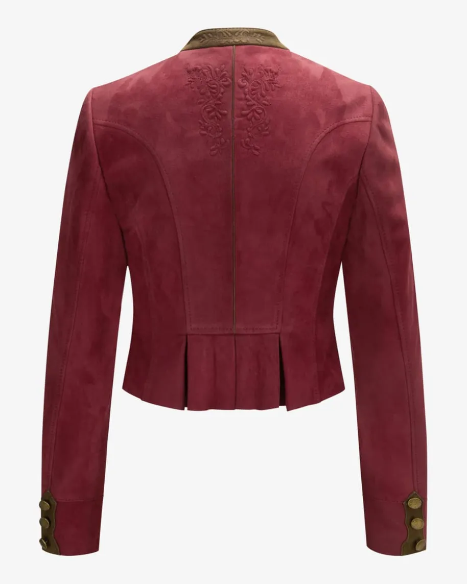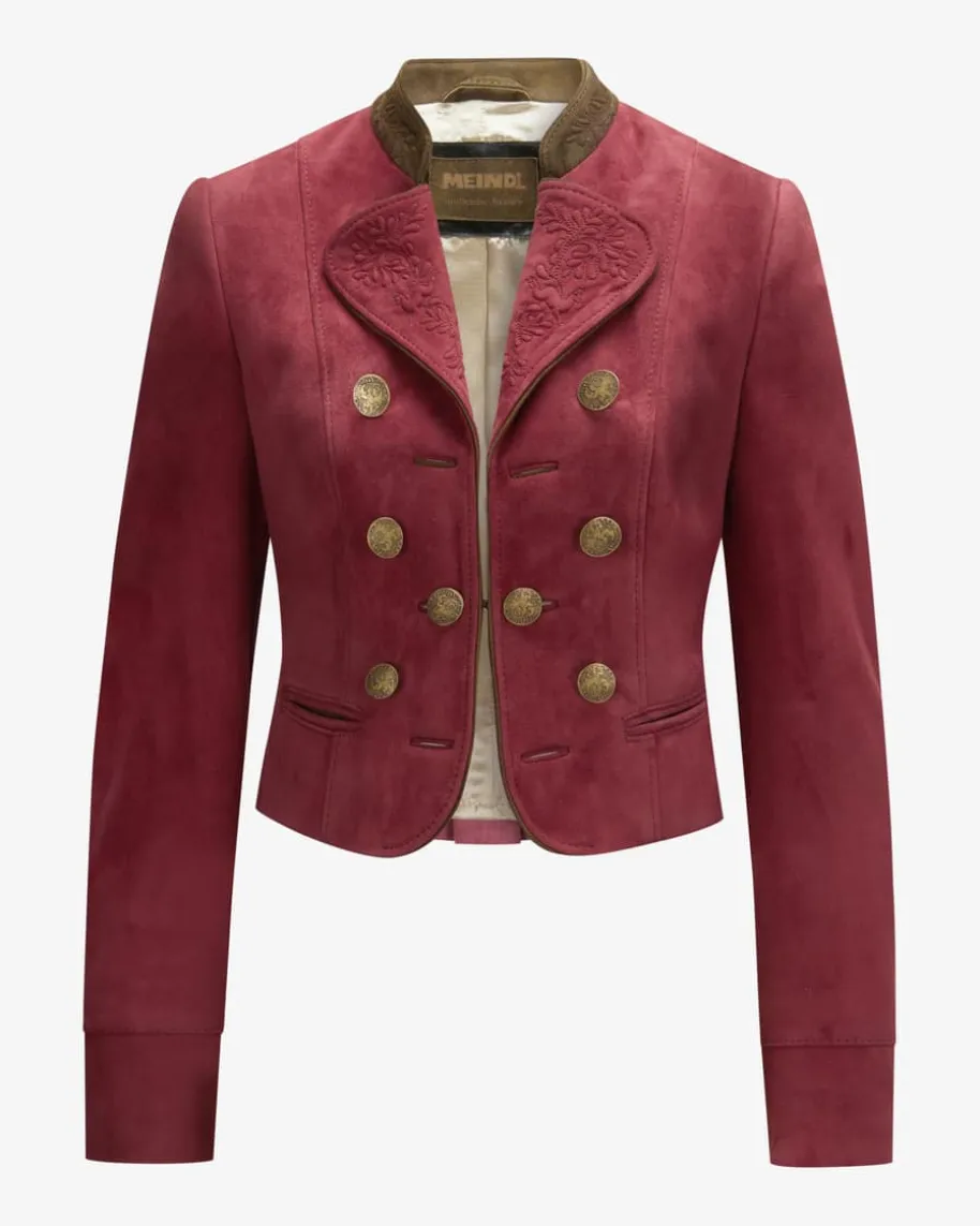 Anna-Lena Trachten-Lederjacke für Damen von Meindl in Roseblood. Lederhandwerkaus Bayern – Bereits 1693 wurden bei Meindl die ersten Produkte aus Ledergefertigt und seit nun mehr als 70 Jahren fertigt das Traditionshaus hochwertigeLederwaren, die von Kennern meist ein Leben lang geschätzt werden. Während dieangenehme Veloursleder-Qualität die traditionelle Aufmachung gekonnt untermalt,überzeugt das Modell dank klassischer Details sowie feinen Stickereien mitfemininem Charme. Zugleich runden das rückseitige Schößchen-Detail undkontrastierende Paspelierungen den Look harmonisch ab.