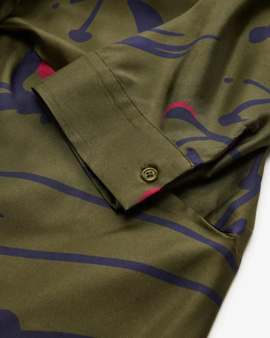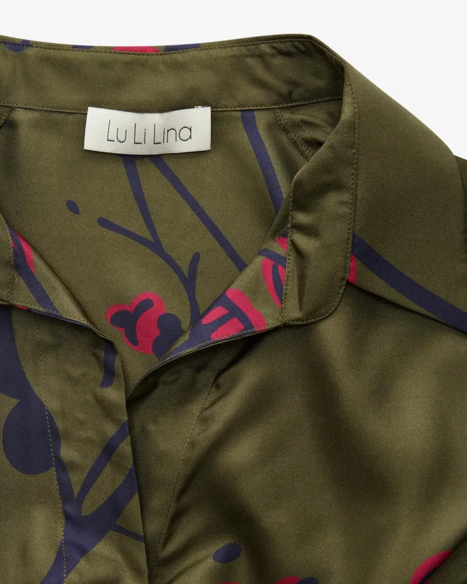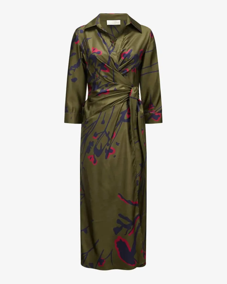 Anna Seiden-Wickelkleid für Damen von Lu Li Lina in Oliv, Blaugrau und Pink. DasModell präsentiert sich mit klassischen Hemdblusen-Details und raffinierterWickel-Funktion, während die fließende Seiden-Qualität mit floralem Allover-Muster sowohl optische als auch haptische Highlights verspricht – Ein Hingucker-Look für vielseitige Styles.