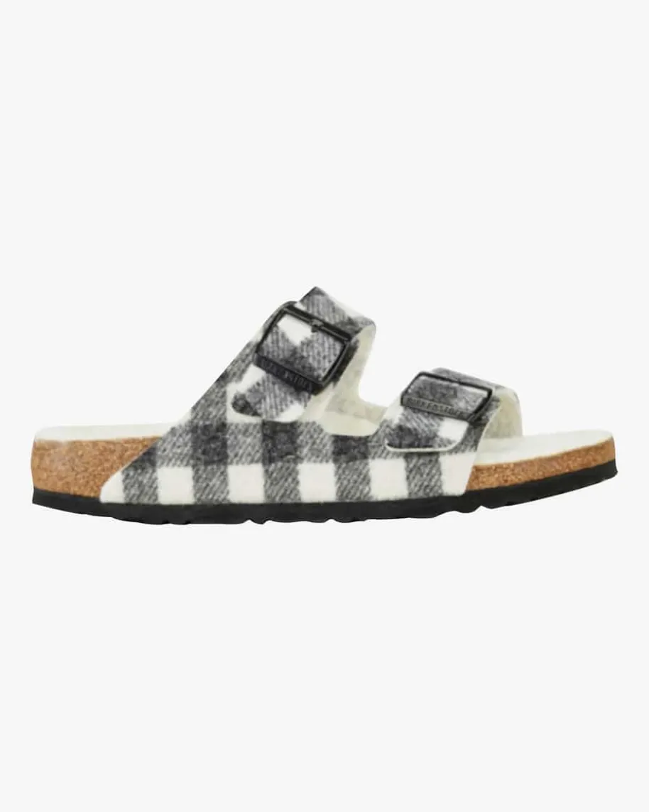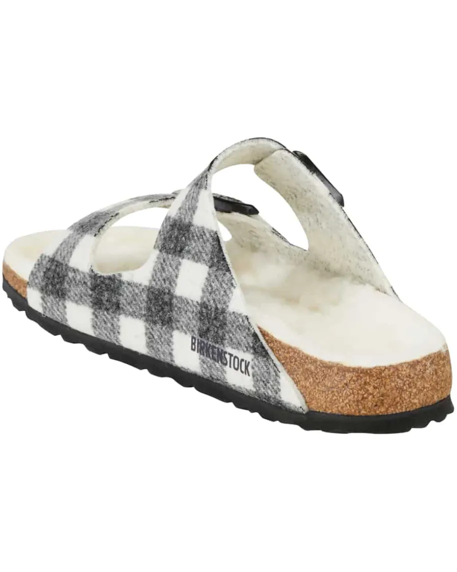 Arizona Sandalen für Damen von Birkenstock in Schwarz und Weiß. Seit über 200Jahren revolutioniert Birkenstock die Schuhindustrie immer neu. Mit seinemeinzigartigen, anatomischen Fußbett hat Birkenstock ein innovativesProduktkonzept auf den Markt gebracht, das bis heute Bestand hat. Das Lammfellsowie das Karo-Dessin sorgen für einen zusätzlichen Eyecatcher des Modells.
