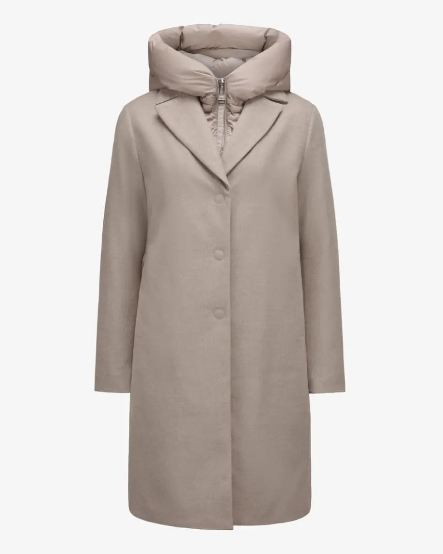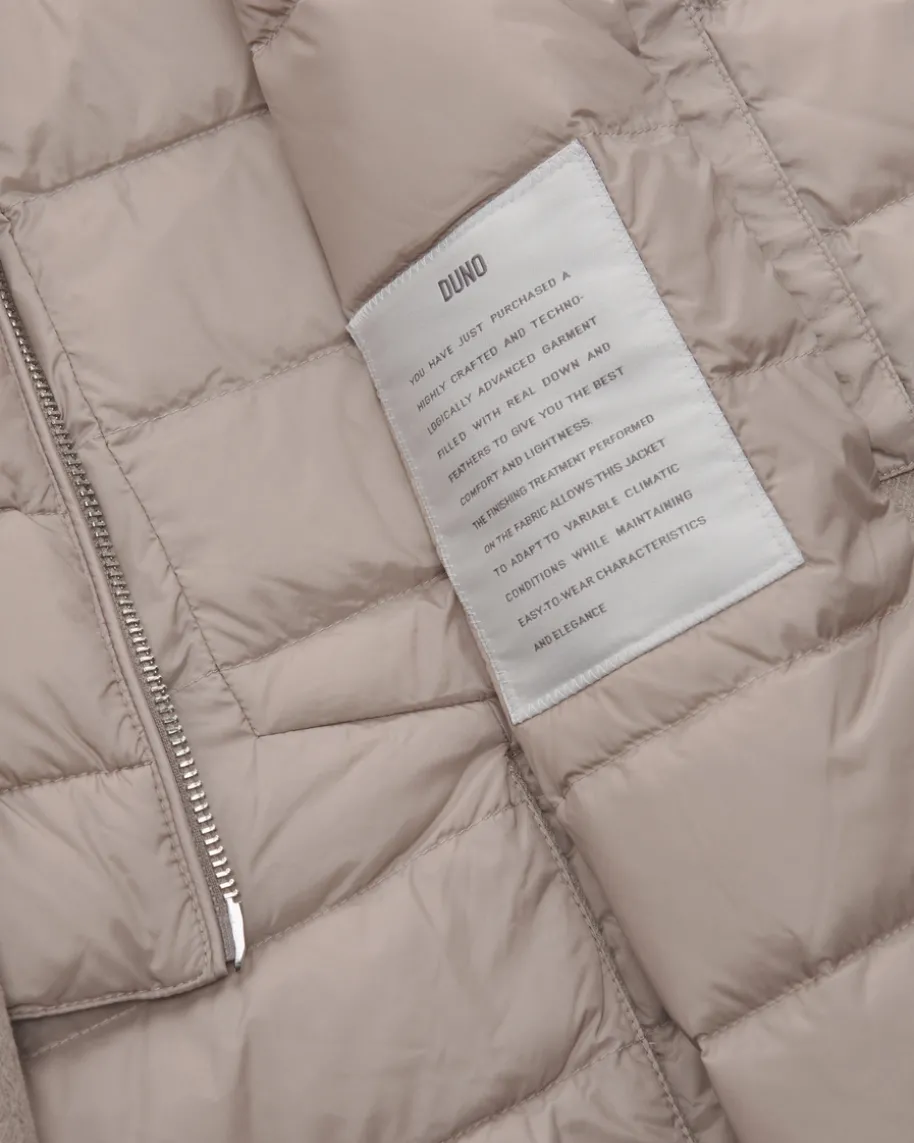 Artemide Daunen-Wollmantel für Damen von Duno in Sand. Made in Italy – Die Markekombiniert funktionale Outerwear mit italienischer Schneiderkunst und einemzeitgemäßen, urbanen Stil. Auch dieses Hybrid-Modell überzeugt dank der leichtenDaunen-Feder-Füllung sowie der heraustrennbaren Steppblende als wärmenderBegleiter mit stilvollem Touch, den Sie je nach Wetterbedingung und Anlass edeloder sportiv stylen können.