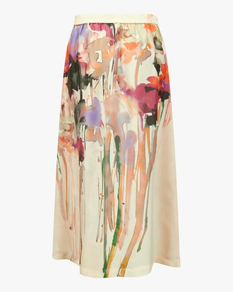 Aruma Seidenrock für Damen von Munthe in Creme und Bunt. Das ausgestellte Modellzeichnet sich besonders durch die fließende Seiden-Qualität aus, die eineelegante Optik und angenehme Haptik kreiert. Zugleich verleiht der farbenfroheund abstrakte Print im Aquarell-Stil das gewisse Etwas.