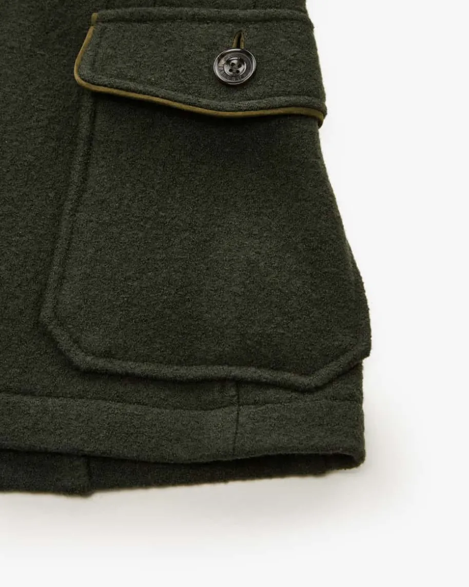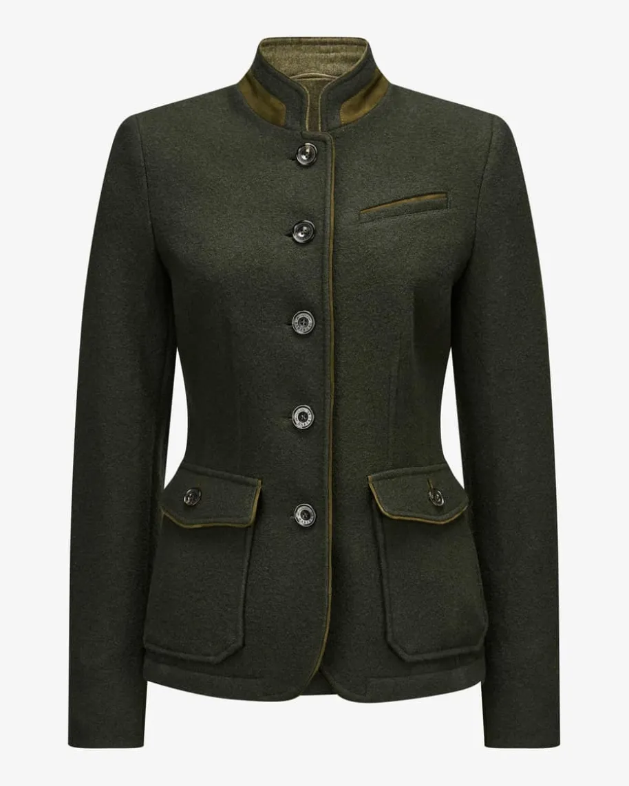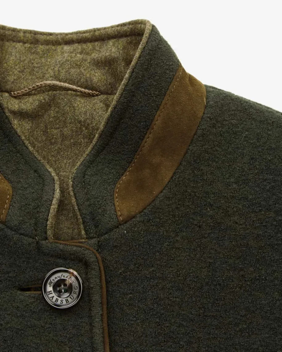 Aschach Trachtenblazer für Damen von Habsburg in Moosgrün und Oliv. Dastaillierte Modell besticht dank der hochwertigen Schurwoll-Qualität mitangenehmem Griff, während klassische Details sowie kontrastierende Veloursleder-Einsätze das traditionelle Gesamtbild perfekt ergänzen.