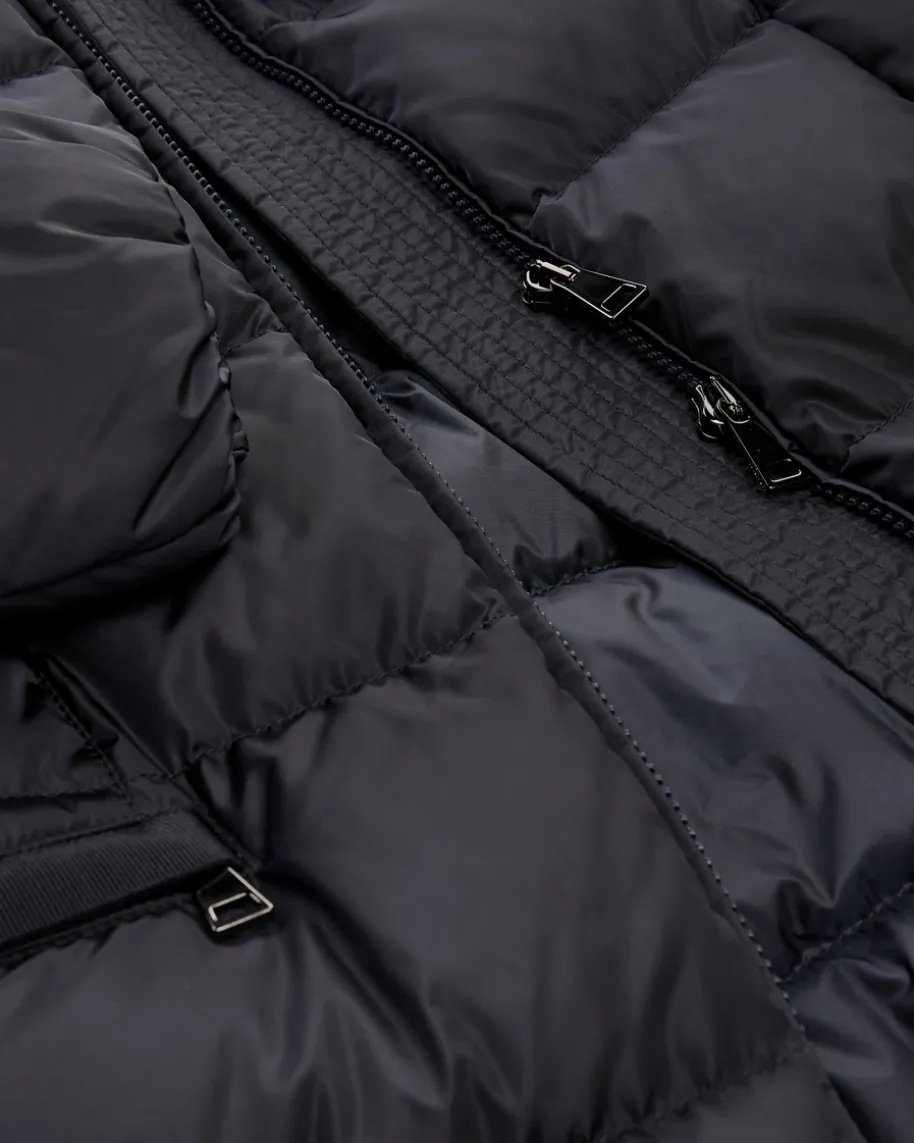 Daunenmantel für Damen von Moncler in Navy. Das Modell in femininer Aufmachungpunktet als Favorit an kühlen Tagen dank der hochwertigen Daunen-Feder-Füllung,während die changierende Stepp-Optik in Verbindung mit klassischen Details einenedlen Touch verleiht.