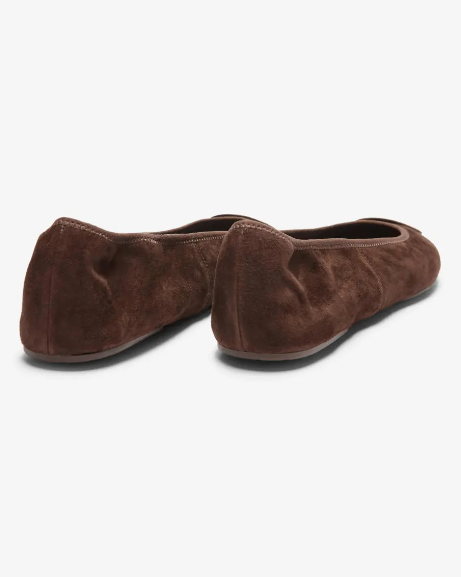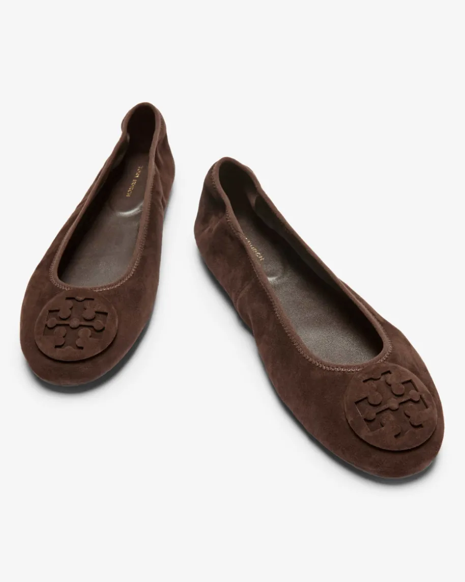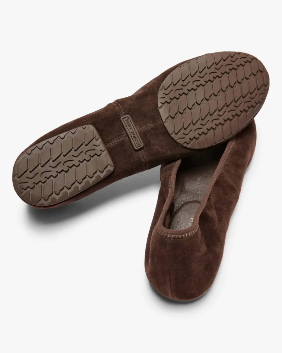 Ballerinas für Damen von Tory Burch in Dunkelbraun. Das Modell präsentiert sichin hochwertigem Veloursleder, während die Logo-Applikation und Ziernähte denLook elegant abrunden.