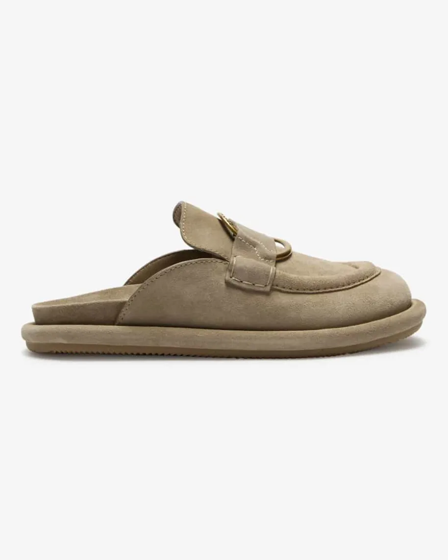 Bell Mule Loafer für Damen von Moncler in Taupe. Dank der hochwertigenVeloursleder- Verarbeitung erhält das Modell einen edlen Look, während Ziernähtesowie der dekorative Querriegel dem angesagten Gesamtbild den letzten Schliffverleihen.