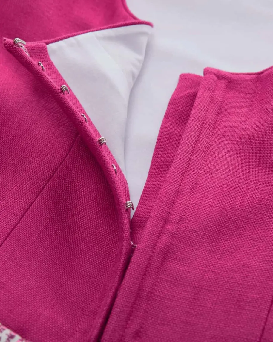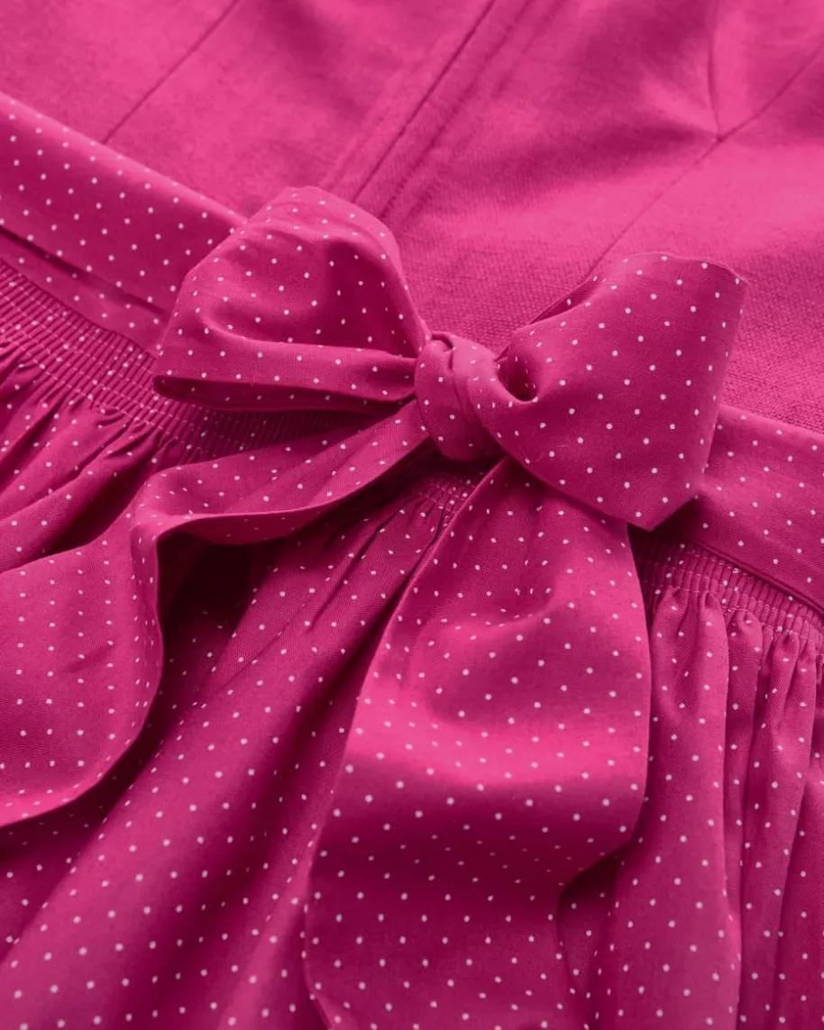 Bette Midi-Dirndl mit Schürze für Damen von Tostmann in Himbeere und Weiß.Trachten-Handwerk aus Österreich – Das Modell überzeugt durch den mit Ornamentengemusterten Rock und klassische Details, während die strukturierte Leinen-Qualität für angenehmen Tragekomfort sorgt. Die Schürze mit Allover-Pünktchen-Dessin rundet den Trachten-Look feminin ab.