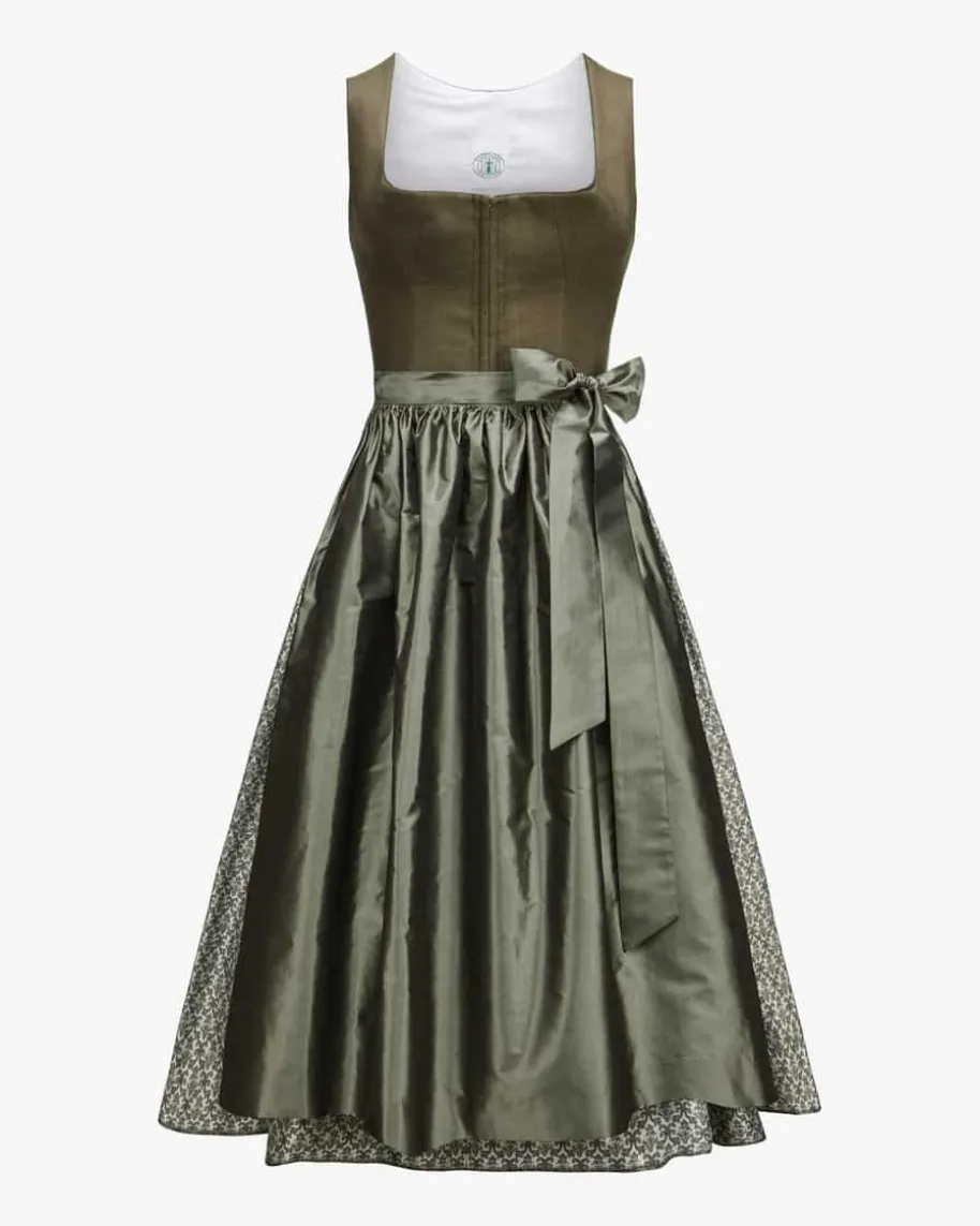 Bette Midi-Dirndl mit Seidenschürze für Damen von Tostmann in Oliv und Salbei.Trachten-Handwerk aus Österreich – Das Modell überzeugt durch den mit feinenOrnamenten gemusterten Rock und klassische Details, während die strukturierteLeinen-Qualität im Mieder für angenehmen Tragekomfort sorgt. Die Schürze auschangierender Seide rundet den Trachten-Look feminin ab.