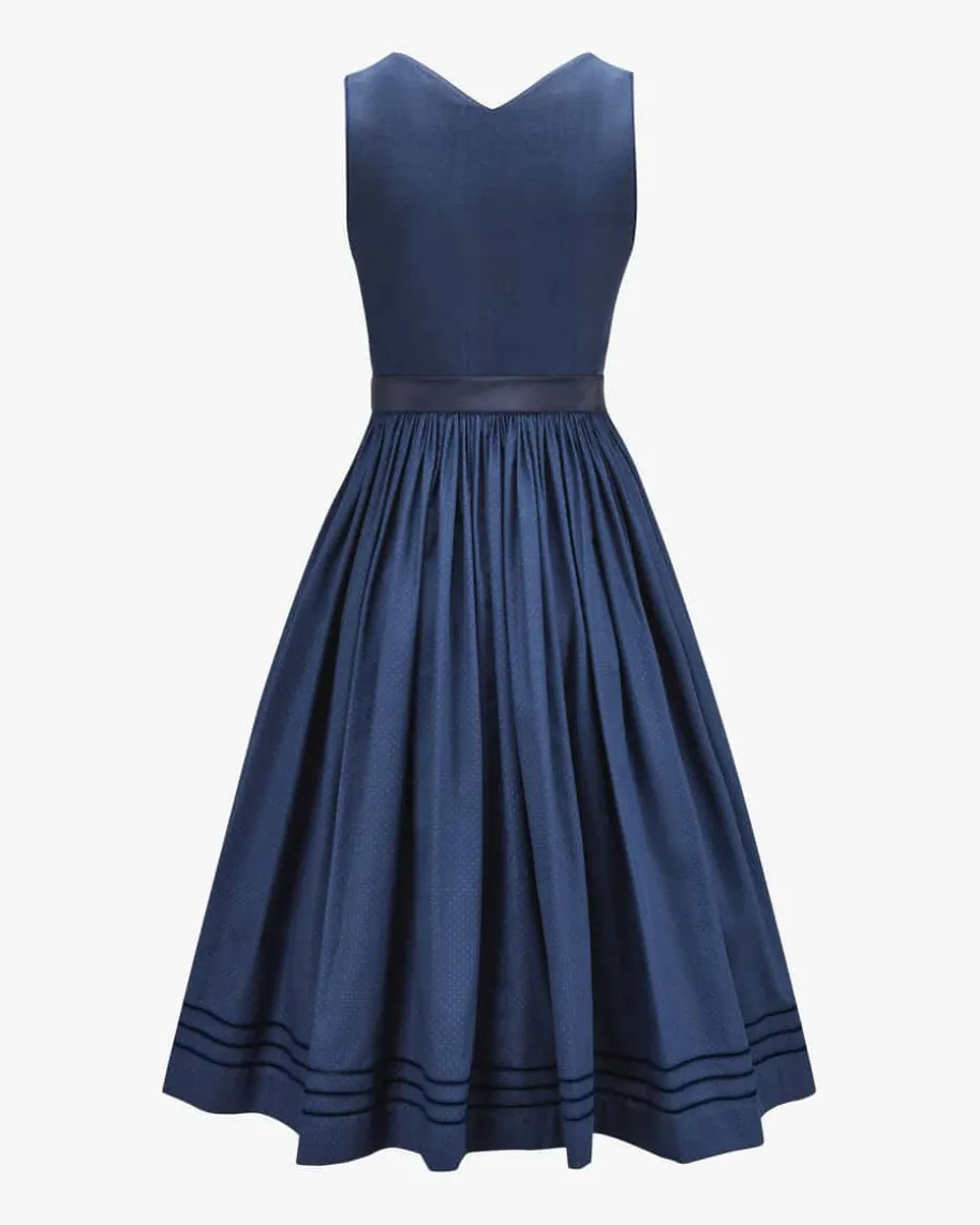 Biana Midi-Dirndl mit Seidenschürze für Damen von Tostmann in Blau. Trachten-Handwerk aus Österreich – Das traditionelle Modell überzeugt durch dengemusterten Rock mit Punkte-Print und klassischen Details, während diestrukturierte Leinen-Qualität im Mieder für angenehmen Tragekomfort sorgt. Diechangierende Seiden-Schürze rundet den Trachten-Look feminin ab.