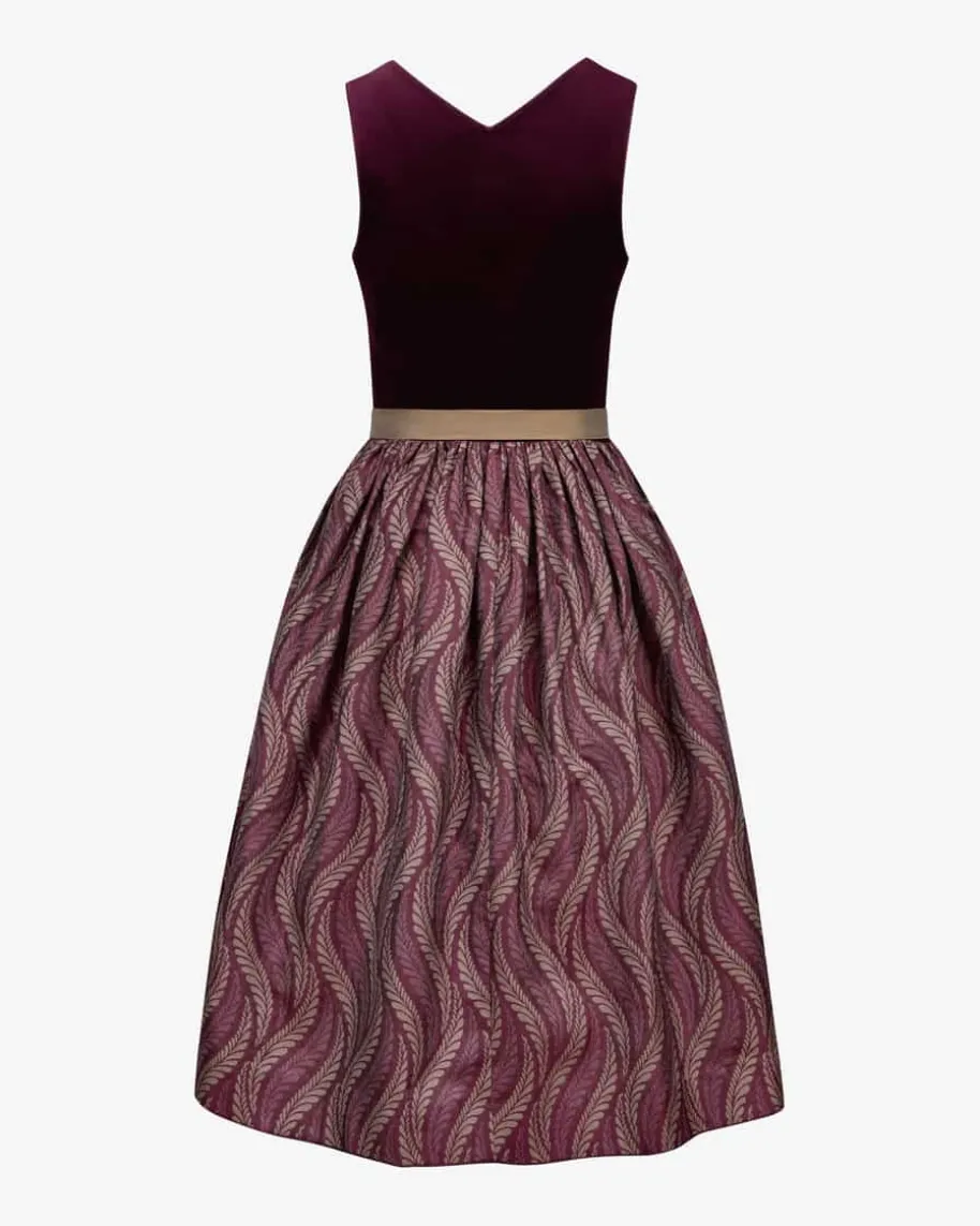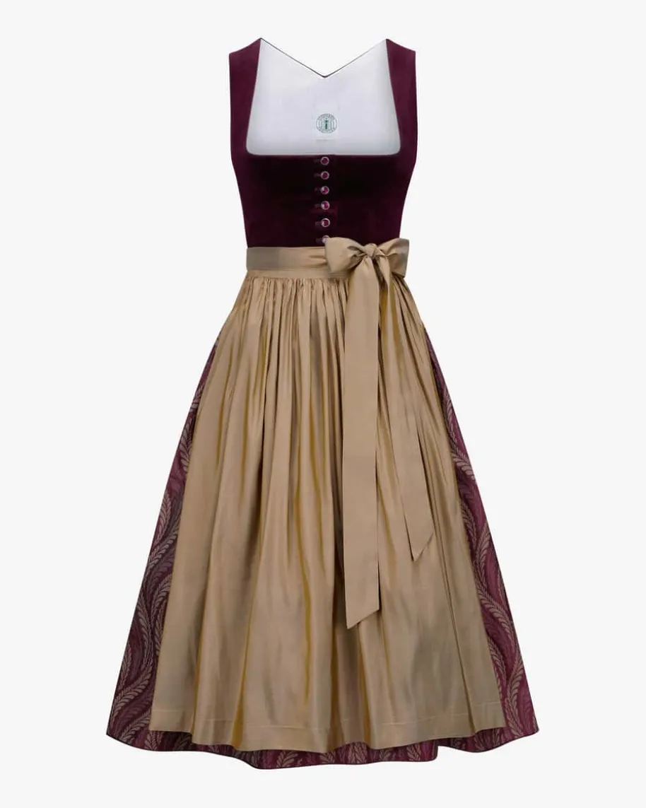Biana Midi-Samtdirndl mit Sylvia Seidenschürze für Damen von Tostmann in DarkPlum, Taupe und Gold. Trachten-Handwerk aus Österreich – Das Modell präsentiertsich dank weicher Baumwoll-Samt-Qualität und floralem Jacquard-Muster infemininer und zugleich traditioneller Aufmachung. Die changierende Schürze aushochwertiger Seide ergänzt das Trachten-Design gekonnt.