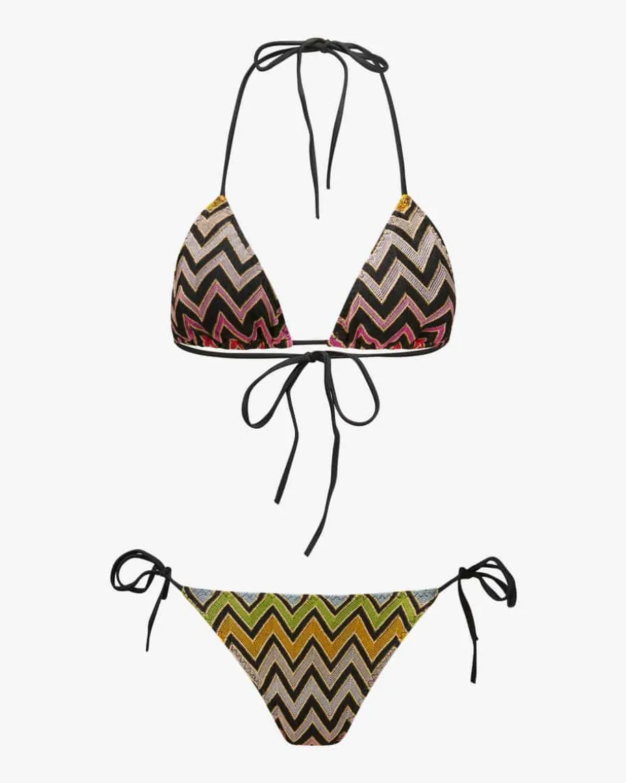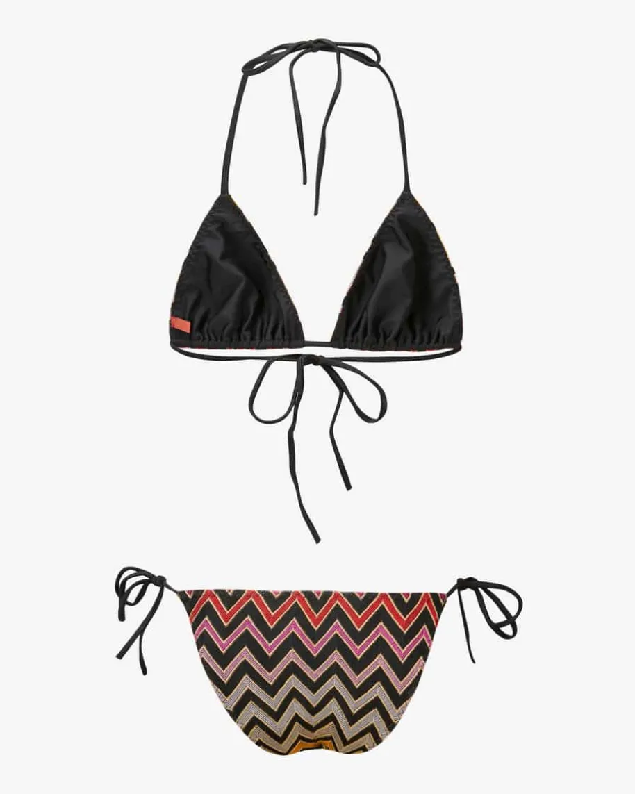 Bikini für Damen von Missoni in Schwarz, Pink und Gold. Das Modell avanciertdank labeltypischem Zick-Zack-Strickdessin mit metallisierten Lurex-Fasern zueinem farbenfrohen Eyecatcher, während die klassische Triangel-Form mitvariabler Schnürung einen klassischen Favoriten für modische Bade-Looks kreiert.