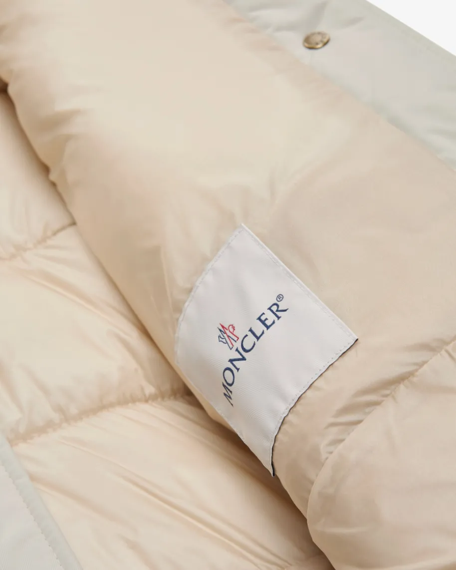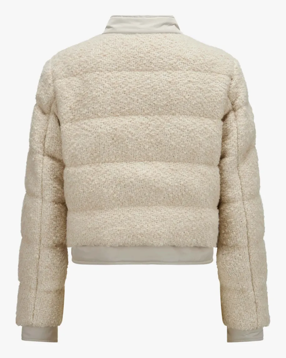Blandy Daunenjacke für Damen von Moncler in Creme. Für hochwertigeDaunenjacken ist das italienische Label weltweit bekannt. Auch dieses Modell inweiter, verkürzter Passform verspricht dank der hochwertigen Daunen-Feder-Füllung eine leichte Wärmeisolierung, während das Bouclé-Design in Kombinationmit den Kugelknöpfen einen modischen Begleiter schafft.
