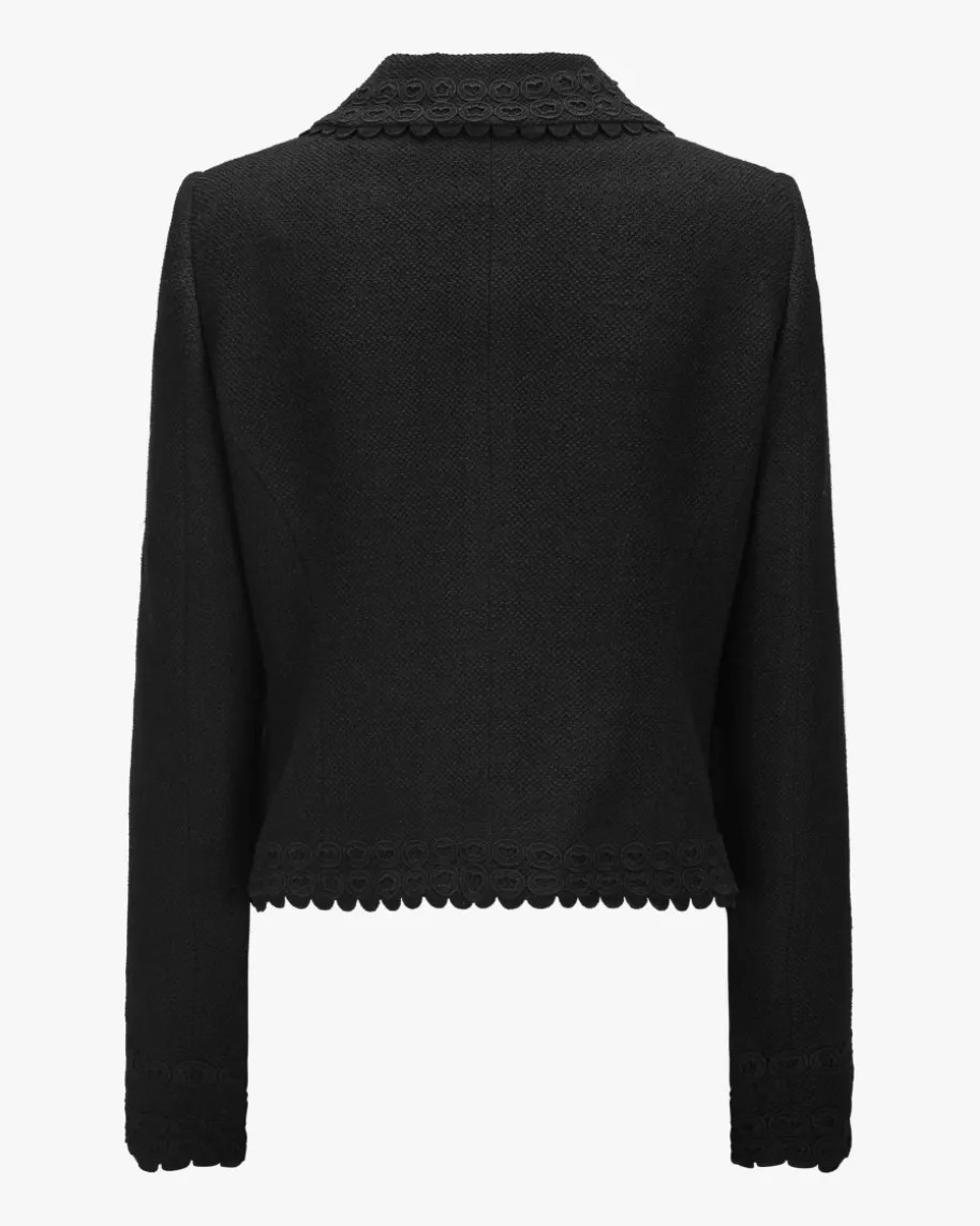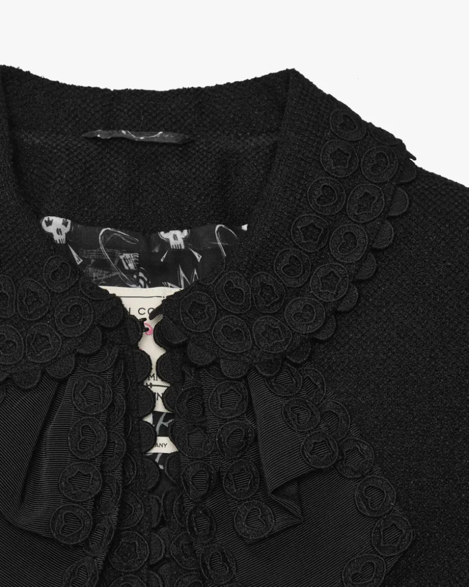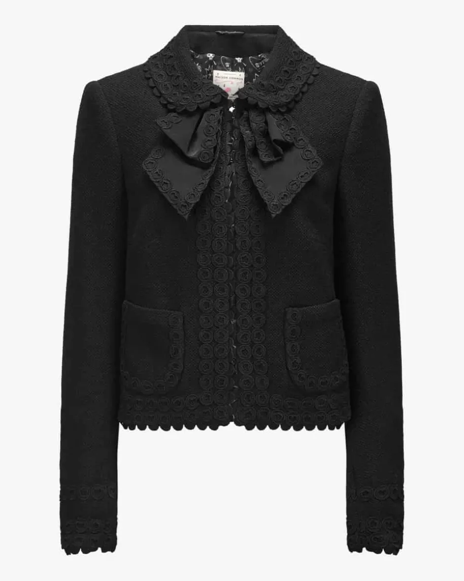 Blazer für Damen von Maison Common in Schwarz. Das Label verkörpert Lebensfreudeund Esprit, die sich neben femininem Charme mit farbenfrohen Designs sowieMustern in den Kollektionen wiederfinden. Dieses Modell aus strukturiertemSchurwoll-Mix präsentiert sich in eleganter Blazerjacken-Silhouette mitSchulterwattierung, während die Häkelspitzen-Applikationen sowie das Schleifen-Detail einen stilvollen Look mit Dark Romance-Charakter kreieren.