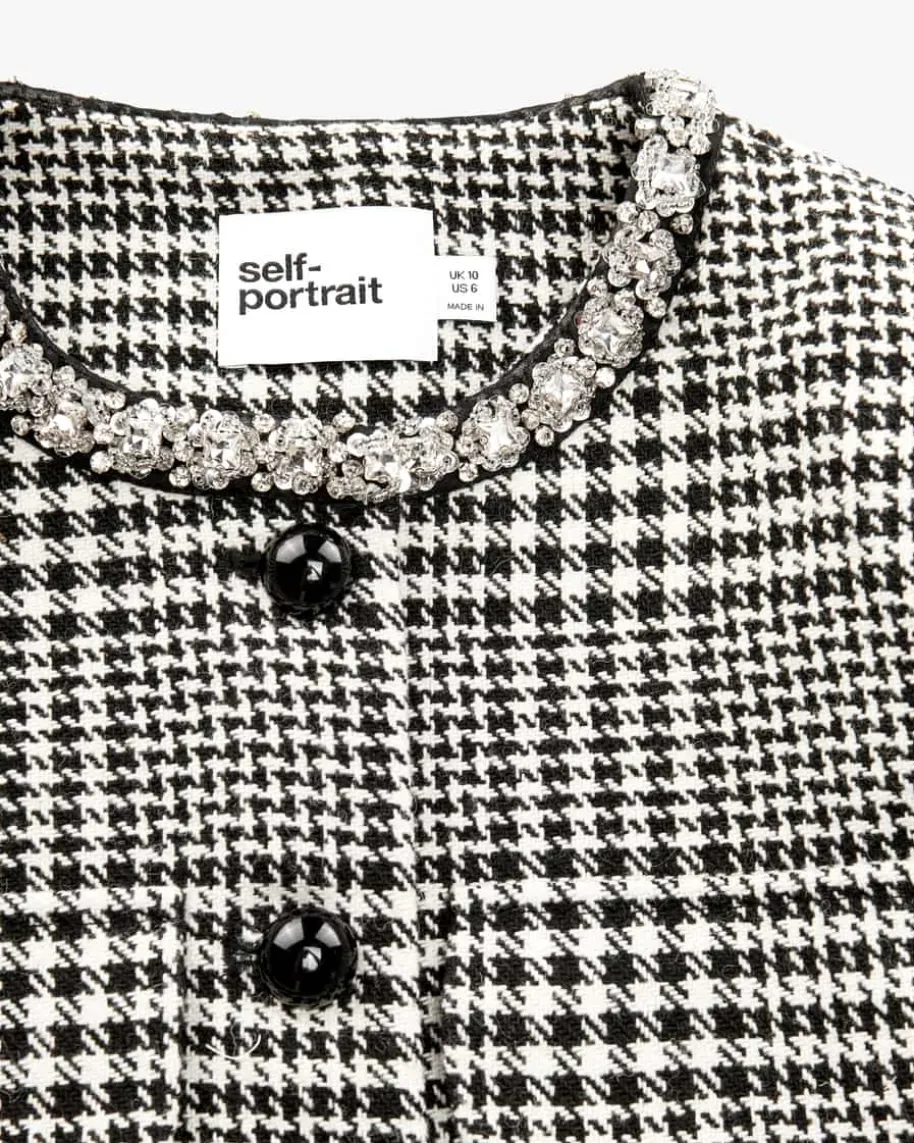 Blazer für Damen von Self-Portrait in Schwarz und Weiß. Das Modell begeistertmit kontrastfarbenem Hahnentritt-Muster und markantem Schmuckstein-Applikationen, die für das gewisse Etwas sorgen. Die verkürzte Passform mitKlappentaschen verleiht dem Tailored Chic Look zudem einen stilvollen Charakter.
