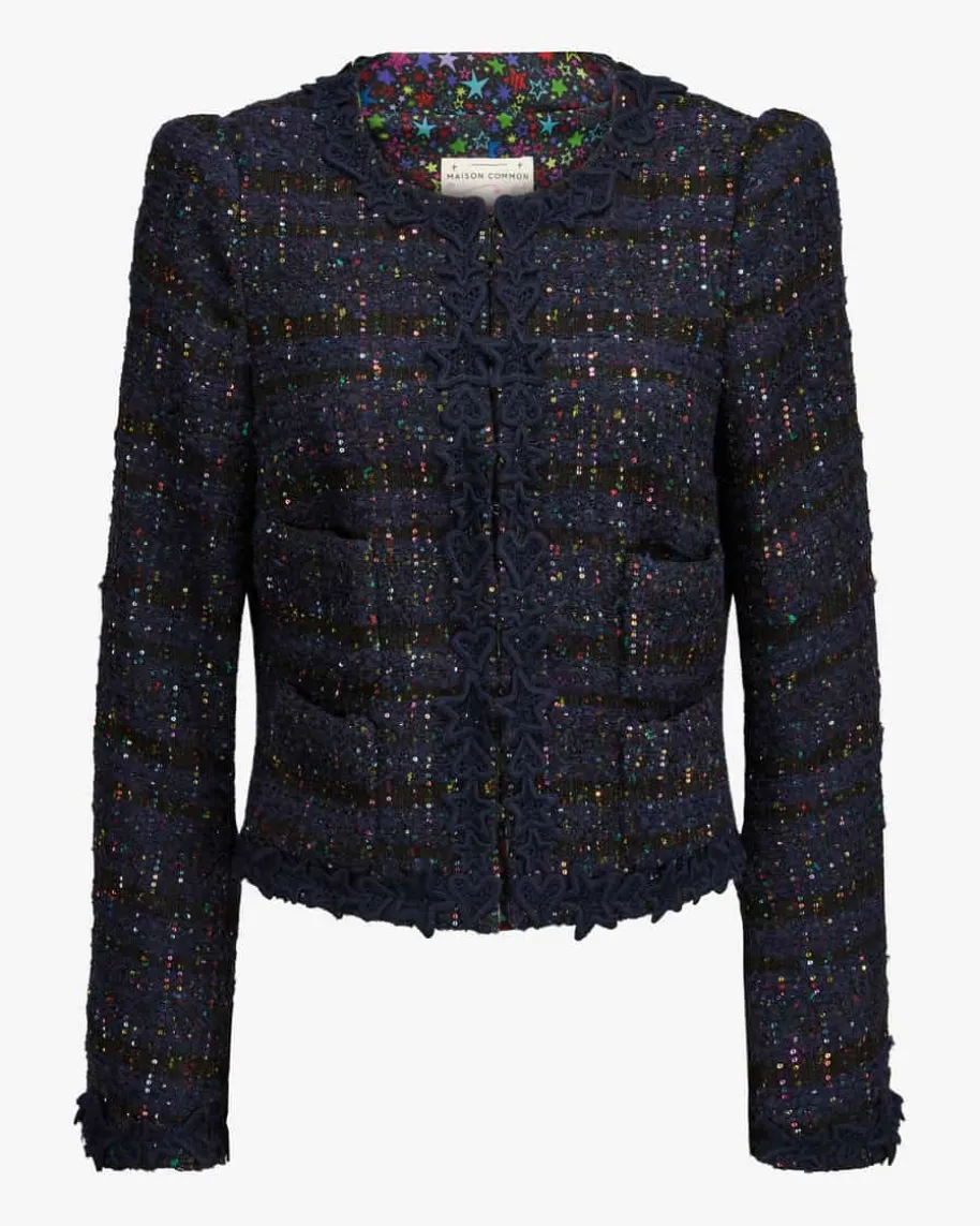 Blazer für Damen von Maison Common in Navy, Schwarz und Bunt. Der kastigeKurzblazer überzeugt mit edler Tweed-Optik aus angenehmer Woll-Mischung, währenddie bunten Pailletten und die originelle Spitzen-Borte verspielte Akzentesetzen. Das farbenfrohe Innenfutter mit Sternen-Muster verleiht den letztenSchliff.