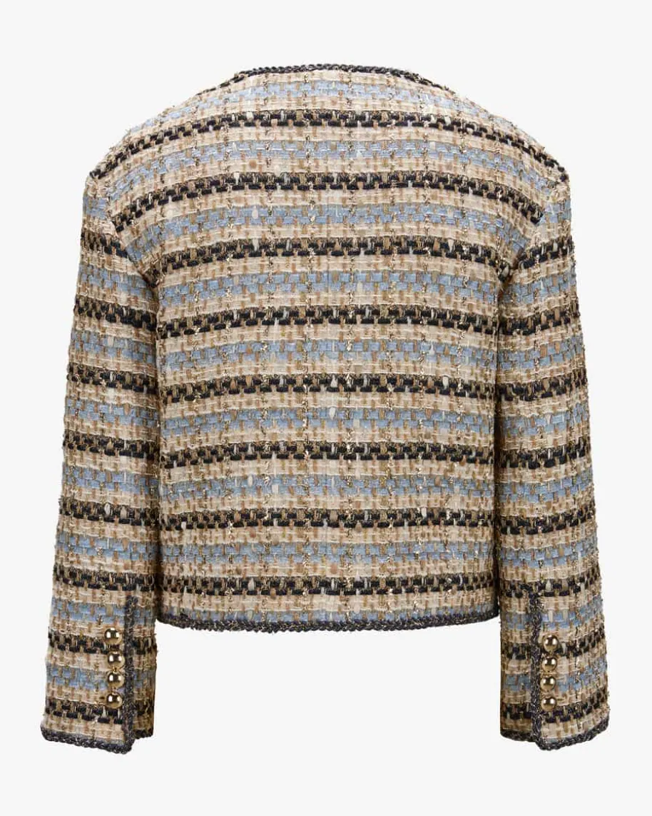 Sumira Blazer für Damen von Veronica Beard in Creme, Hellblau und Navy. DieKastenjacke überzeugt durch ihren klassischen Bouclé-Look sowohl haptisch alsauch optisch und avanciert dank der goldfarbenen Kugelknöpfen zum edlenBegleiter für stilsichere Auftritte.