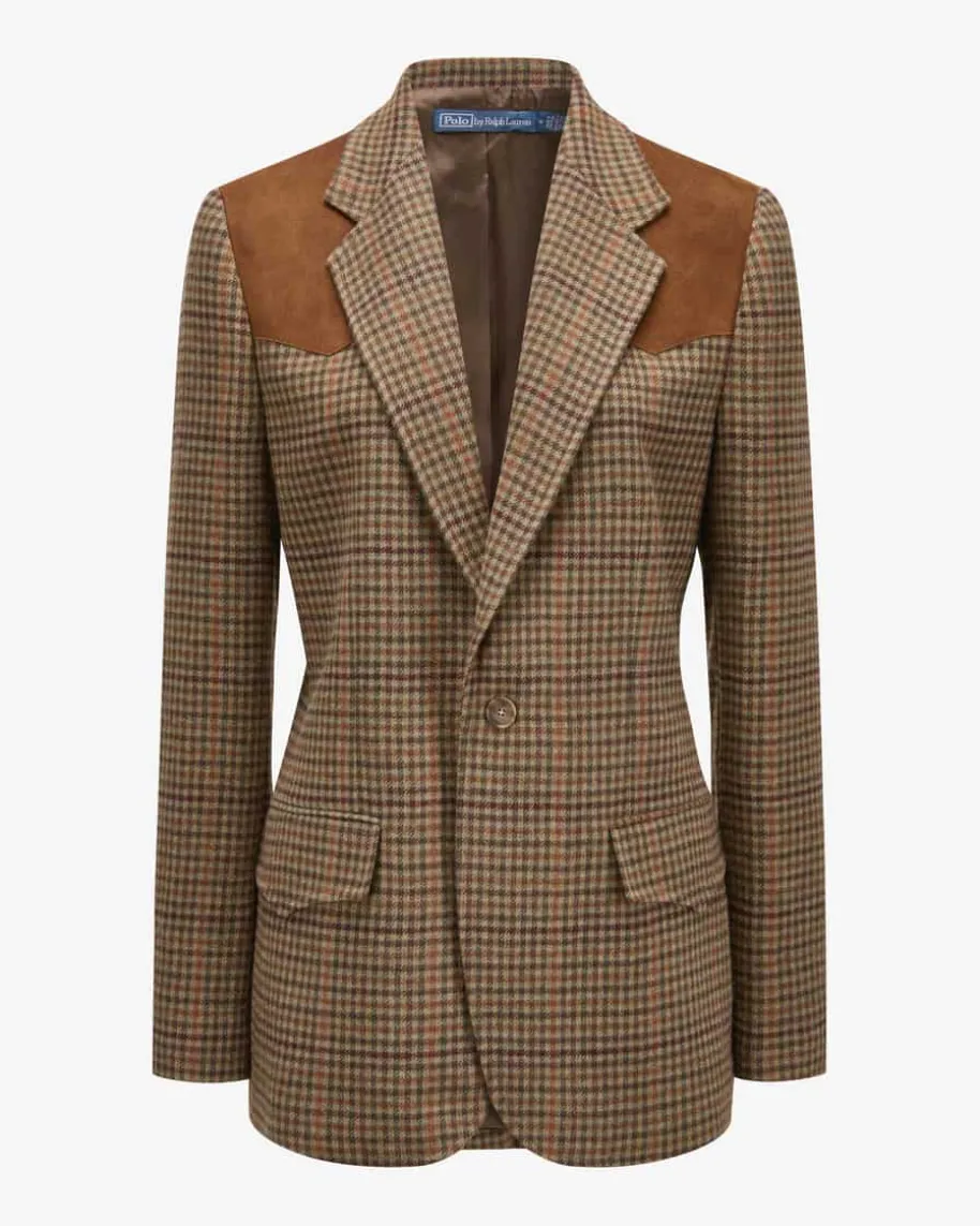 Blazer für Damen von Polo Ralph Lauren in Cognac, Oliv und Braun. Eine Ikone desamerikanischen Lifestyles – sportlich, preppy, klassisch. Auch dieses Modellüberzeugt mit taillierter Silhouette und weicher Woll-Qualität, die angenehmeTragemomente garantiert. Das klassische Karo-Muster und der markante Wildleder-Besatz runden den stilvollen Look mit Equestrian Vibes ab.