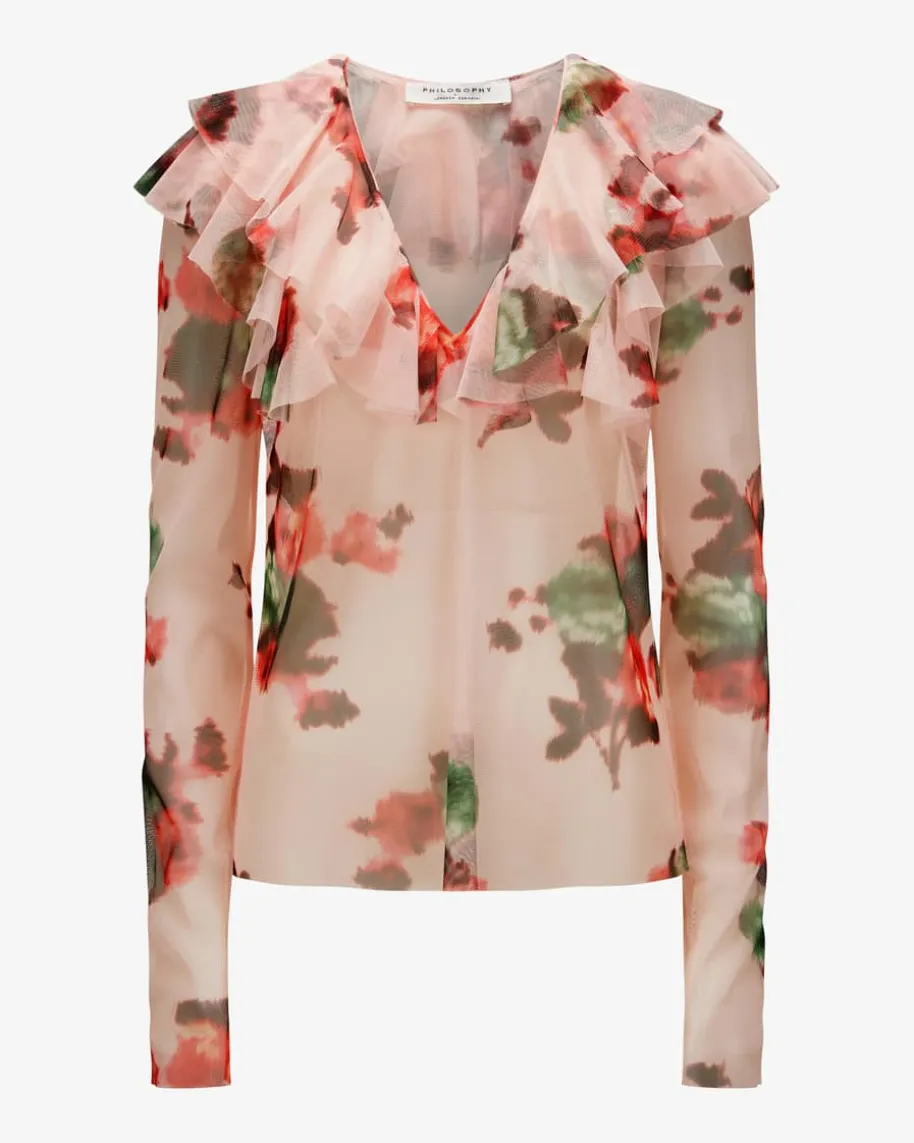 Bluse für Damen von Philosophy in Rosé, Rot und Dunkelgrün. FeminineLeichtigkeit mit sinnlich-eleganter Note – Das verkörpert das Label mit ihrerinnovativen Anlassmode. Das Modell präsentiert sich in semitransparenter Mesh-Aufmachung, welche durch das Blumenmuster stilvoll ergänzt wird. Zugleich setzendie Volants-Details entlang des Ausschnitts besondere Akzente.