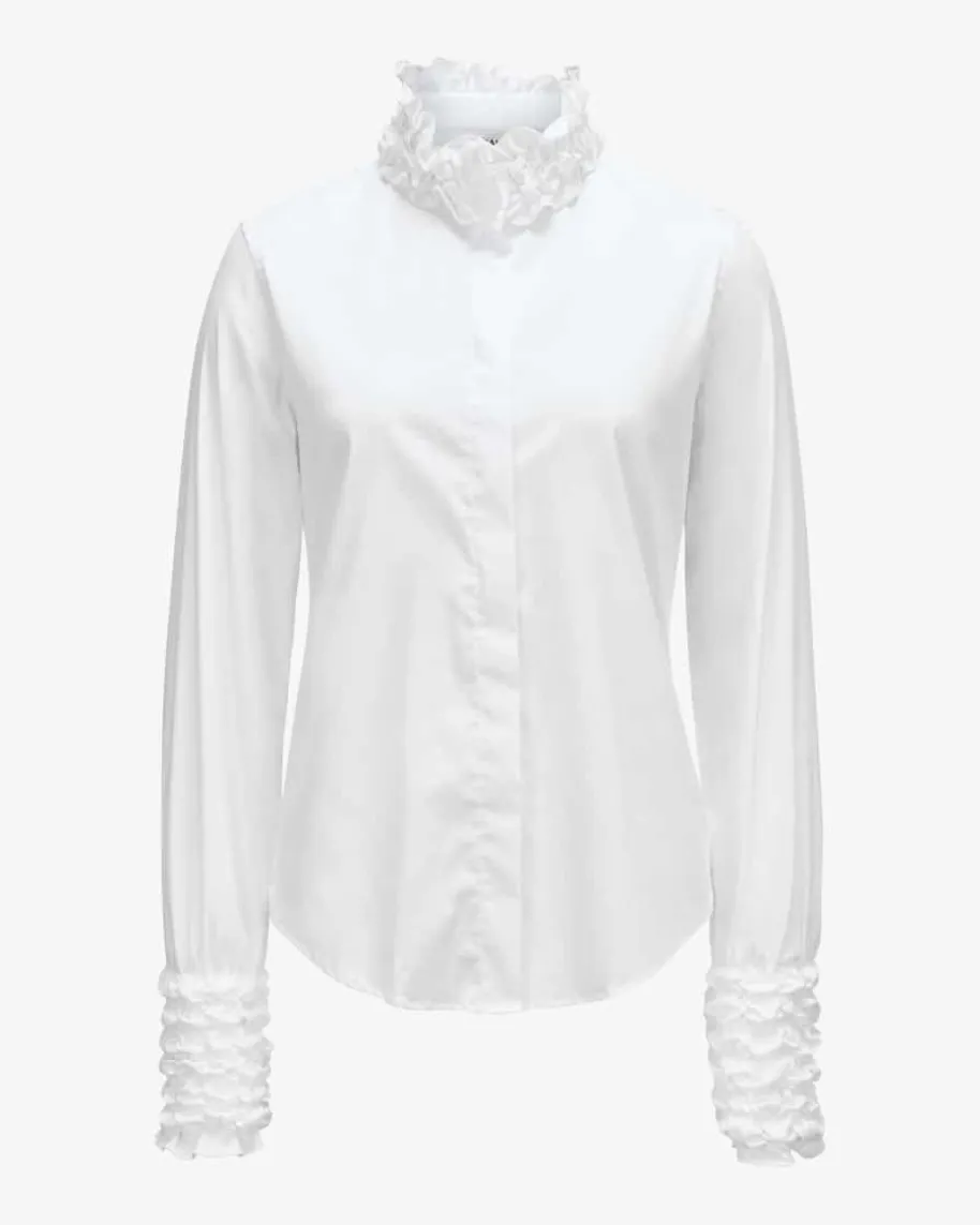 Bluse für Damen von Caliban in Weiß. Das Modell aus elastischer Baumwollepräsentiert sich in femininer Silhouette, während die extravaganten Smok-Abschlüsse einen edlen Charakter verleihen.