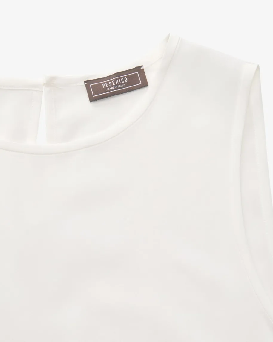 Blusentop für Damen von Peserico in Off-White. Das Modell überzeugt dank deselastischen Seiden-Mix mit einem besonders angenehmen Tragegefühl, während dasasymmetrische Design mit beidseitigem Volant-Detail und einseitig abgerundetemSaum einen besonderen Favoriten mit Sinn für Stil schafft. Die feinenSchmuckketten-Applikationen setzen zudem charakteristische Akzente.