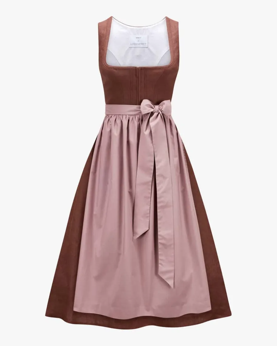 Bodensee Viky Leinendirndl lang mit Schürze für Damen von Viky x LODENFREY inKastanie und Rosa. Die Influencerin Viky Rader kreiert moderne Essentials mitminimalistischer Ästhetik – designed in Germany. Auch dieses Modell punktet dankder hochwertigen Leinen-Qualität, während die schlichte Baumwoll-Schürze denTrachten-Look gekonnt ergänzt.
