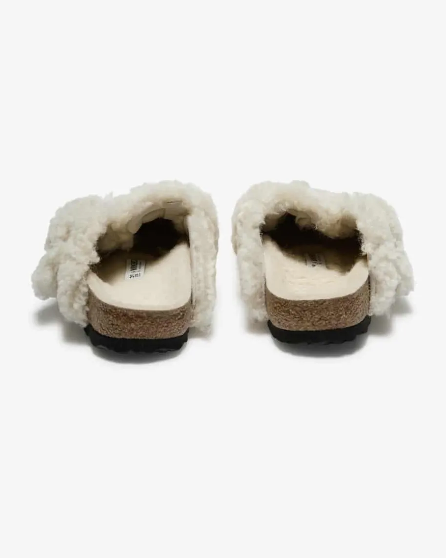 Boston Big Buckle Teddy Pantoletten für Damen von Birkenstock in Creme. Seitüber 200 Jahren revolutioniert Birkenstock die Schuhindustrie immer neu. Mitseinem einzigartigen, anatomischen Fußbett hat Birkenstock ein innovativesProduktkonzept auf den Markt gebracht, das bis heute Bestand hat. Die Lammfell-Qualität macht das Modell in Kombination mit der goldenen Dornschließe zu einemmodischen sowie bequemen Begleiter.