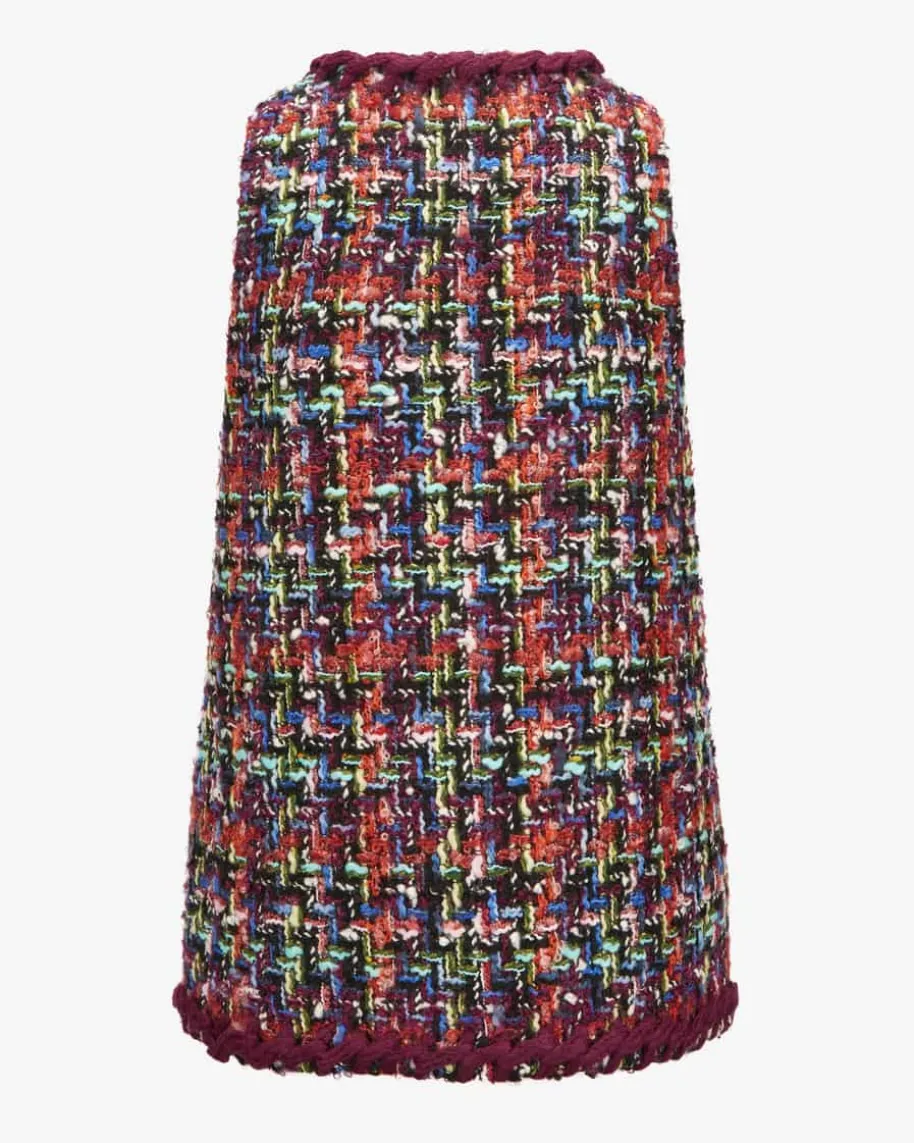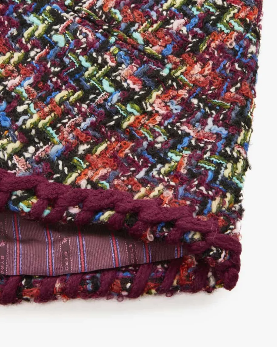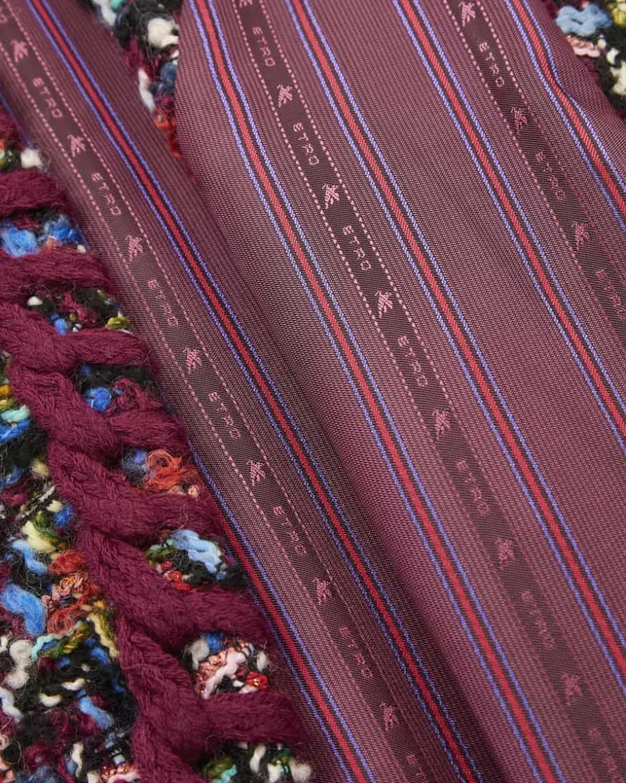 Bouclé-Weste für Damen von Etro in Bordeaux und Bunt. Das gefütterte Modell ausschwerem Woll-Mix punktet dank der farbenfrohen Bouclé-Aufmachung mitgeflochtenen Elementen als besonderes Fashion-Highlight, welchem die Logo-Knöpfeden letzten Schliff verleihen.