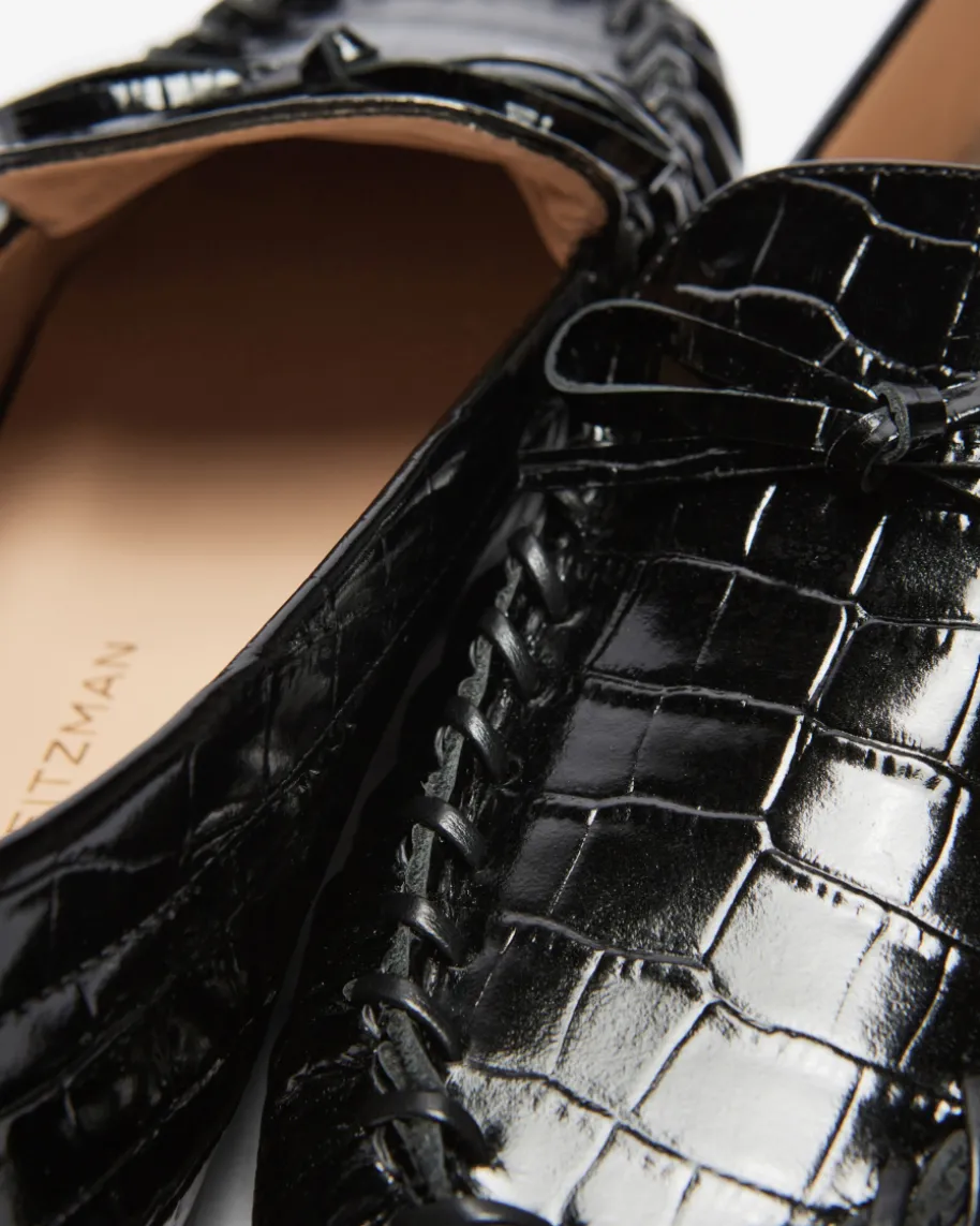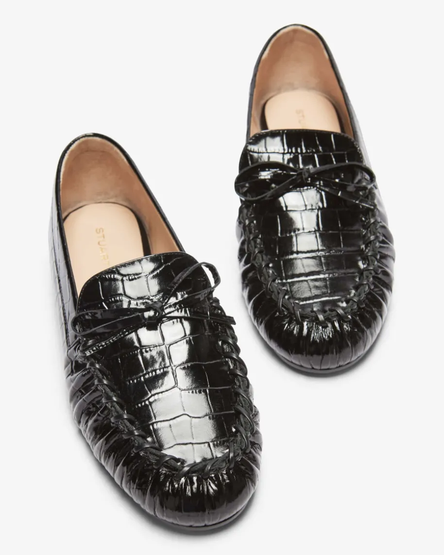 Britt Bow Mokassin für Damen von Stuart Weitzman in Schwarz. Die US-Marke istweltbekannt für elegante Pumps, Overknees und Bridal-Heels – luxuriös, abertragbar. Dieses Modell überzeugt dank des modischen geprägten Glattleders alsbesonderer Favorit, während die klassische Mokassin-Optik ein harmonischesGesamtbild kreiert.