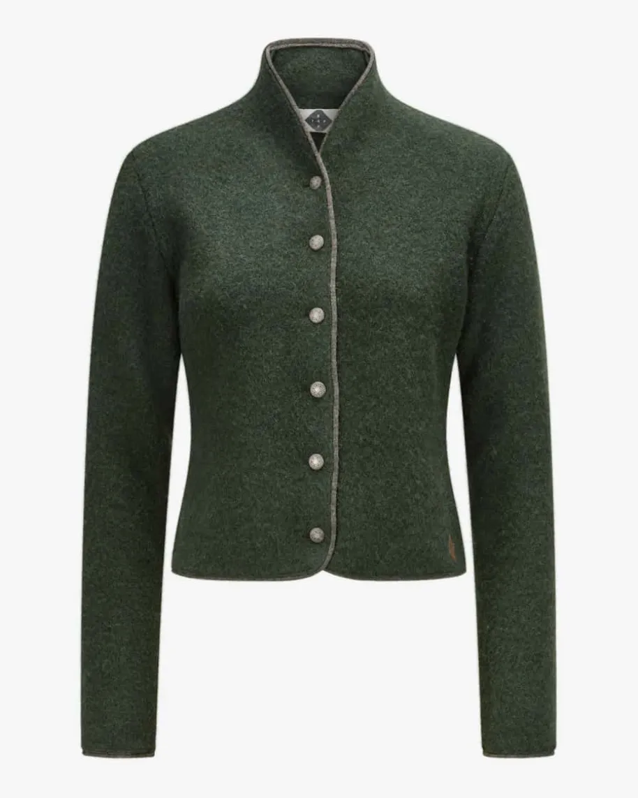 Bruni Trachten-Strickjacke für Damen von Stapf in Fichte und Grau. Für einoptisches Highlight sorgt das traditionelle Modell aus feiner Schurwolle-Qualität, die für angenehmen Tragekomfort sorgt. Kontrastfarbene Paspeln undLogo-Details runden den Trachten-Look harmonisch ab.