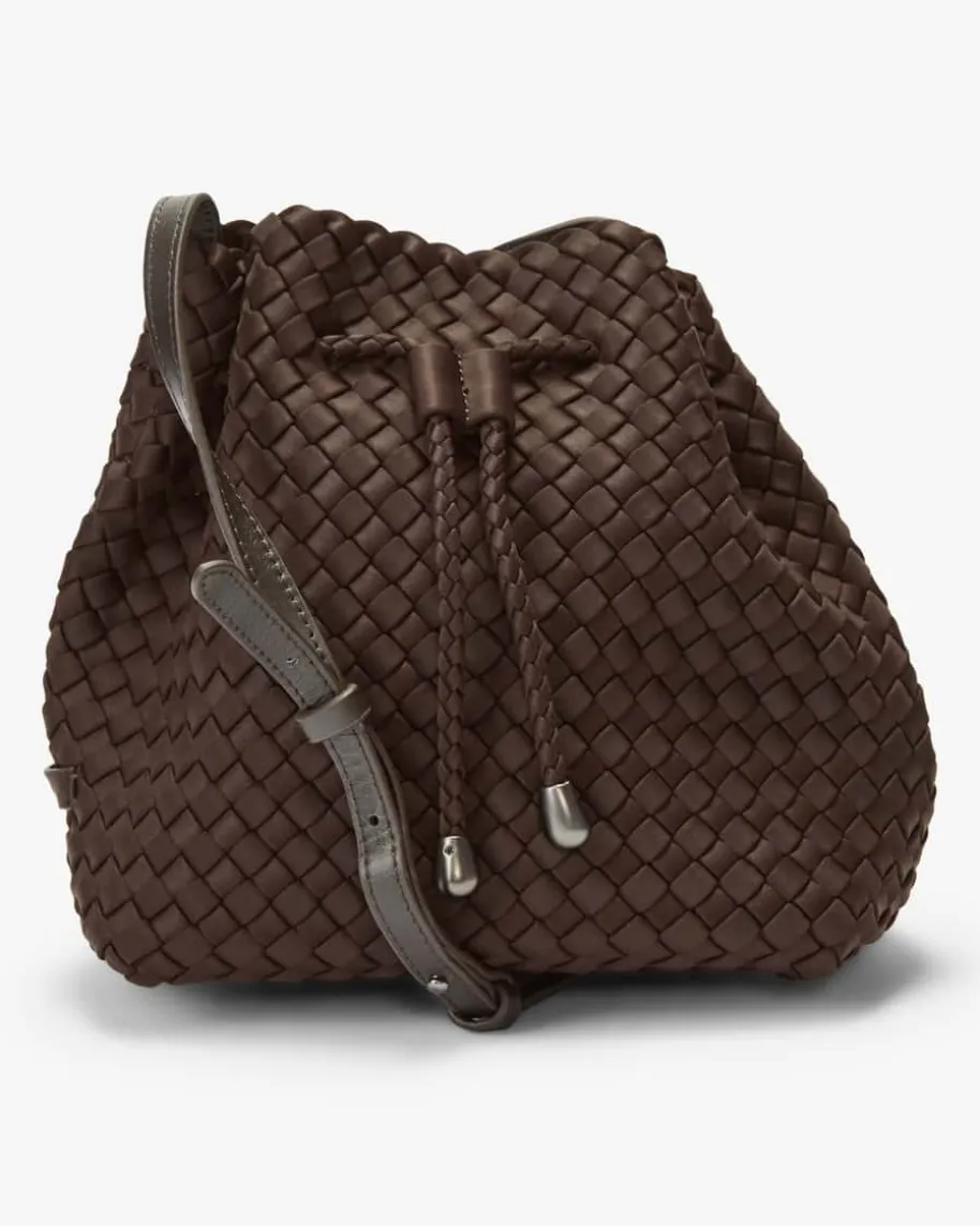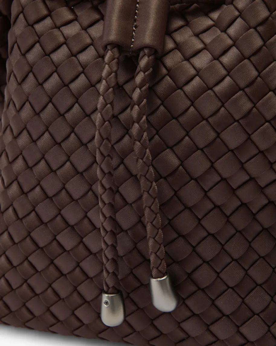 Gramercy Medium Bucket Umhängetasche für Damen von Naghedi in Schoko. Diesestextile Modell präsentiert sich in dezent changierender Optik und edler Flecht-Aufmachung, während das Bucket-Design mit Kordelzug-Verschluss einen modischenBegleiter kreiert.