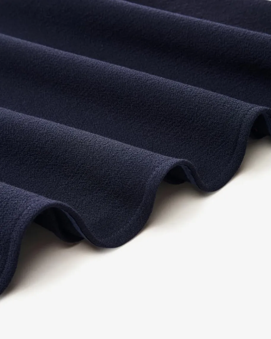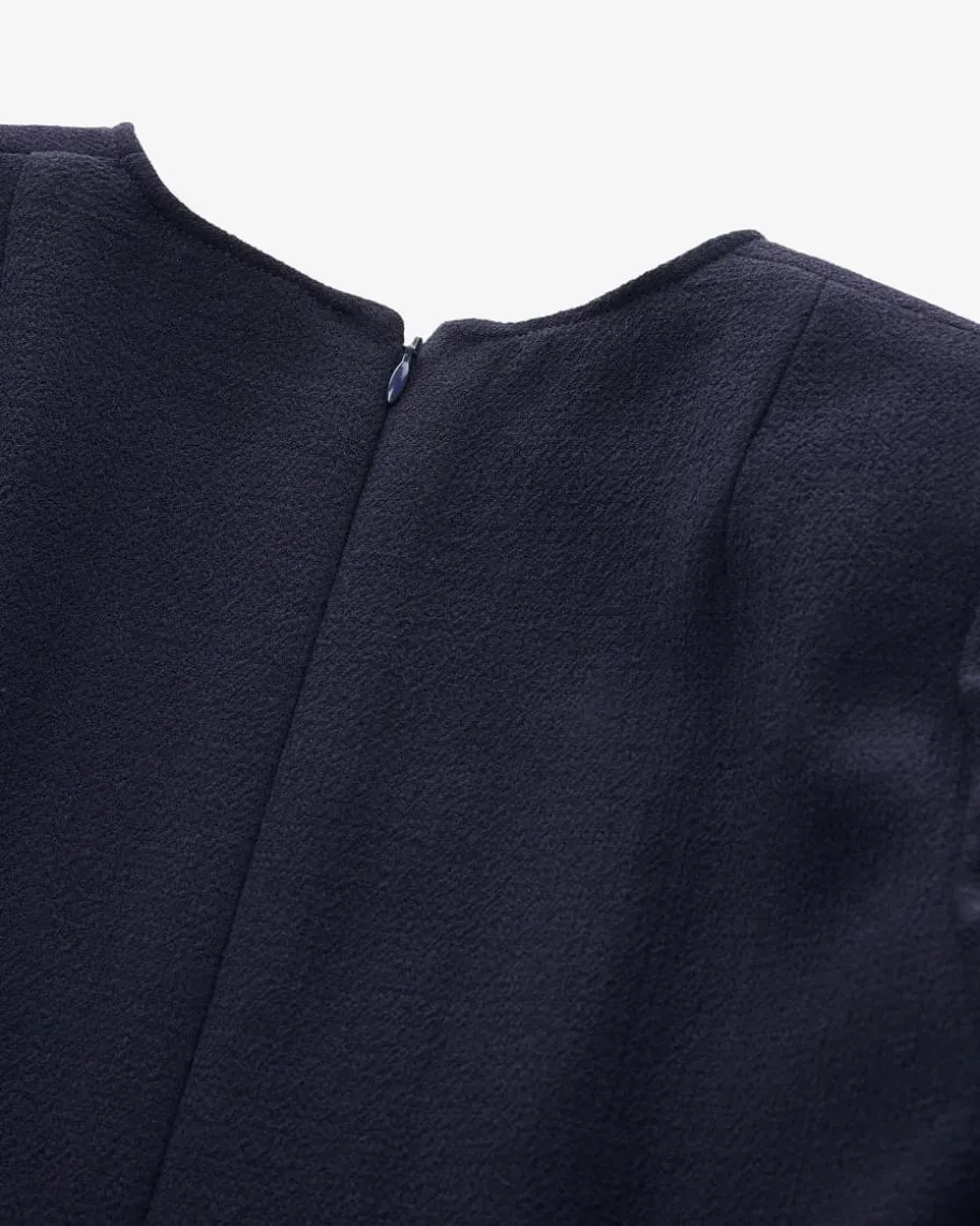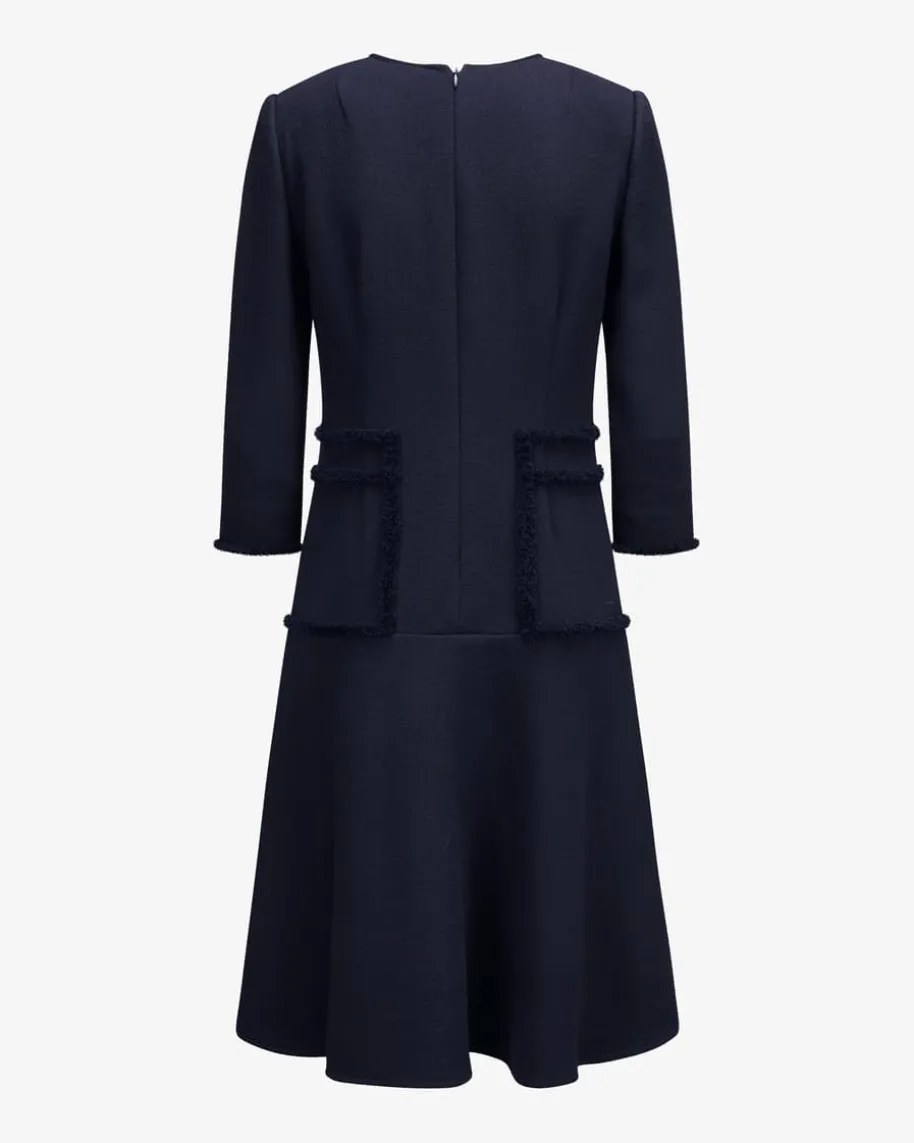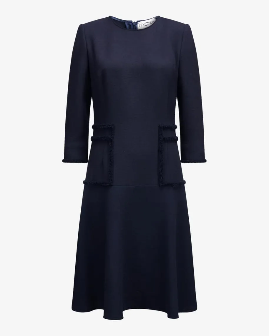 Calla Kleid für Damen von Pio O’Kan in Marine. Zeitloser Luxus und moderneEleganz prägen den Stil dieses Modells – Die taillierte Silhouette und derausgestellte Rock garantieren femininen Schwung, während die feste Double-Crepe-Qualität und tonige Fransenborten einen modernen Begleiter mit 50er Jahre Touchkreiert.