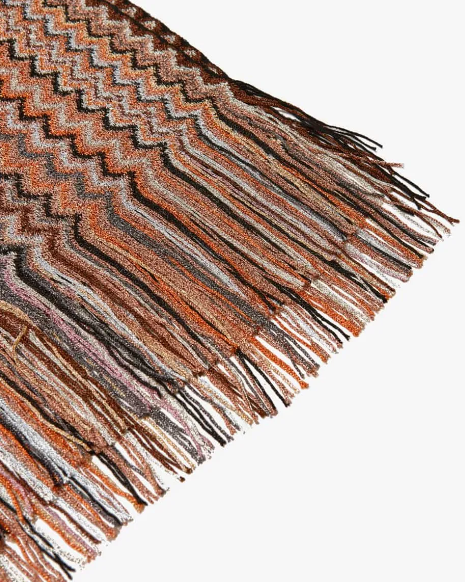 Cape für Damen von Missoni in Braun, Orange und Schwarz. Mit metallischenGlitzerfasern präsentiert sich dieses Modell in changierender Strick-Aufmachung,welcher das Label dank des Zick-Zack-Musters gekonnt widerspiegelt. Die Fransen-Details vollenden den Look harmonisch.