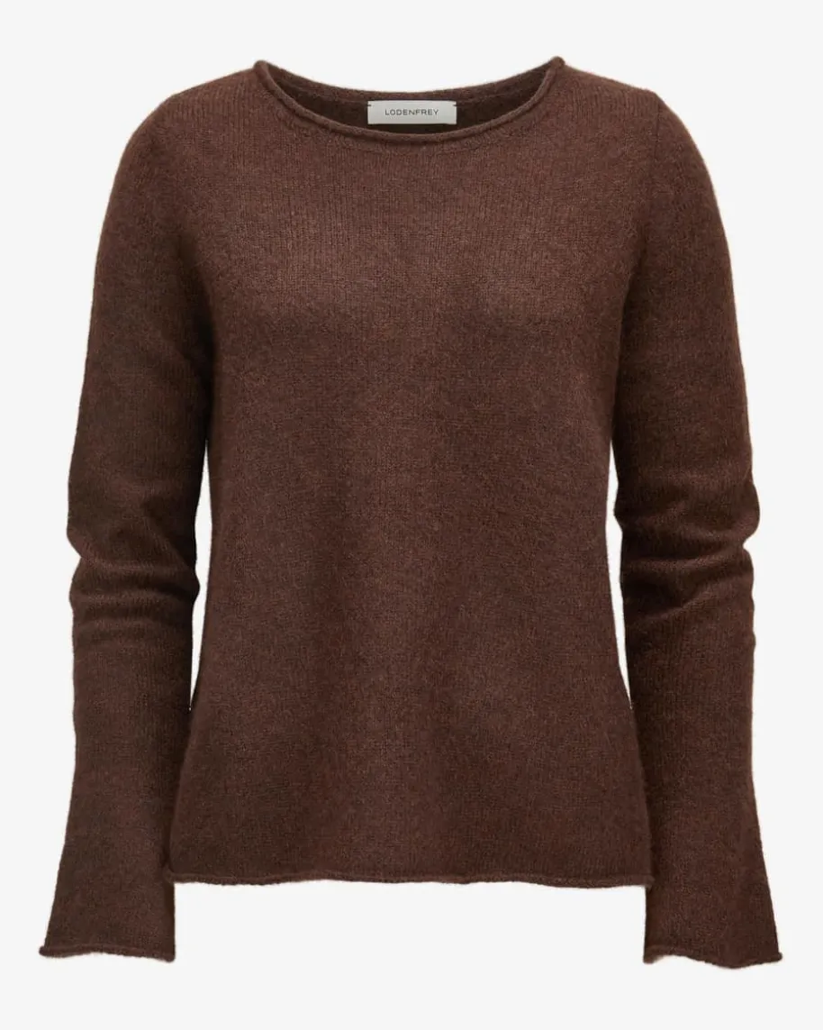 Cashmere-Pullover für Damen von LODENFREY in Schoko. Das ausgestellte Modellpräsentiert sich als femininer Begleiter mit zarten Details, während diehochwertige Cashmere-Seiden-Qualität mit dezentem Schimmer einen beliebtenCasual Favoriten kreiert.