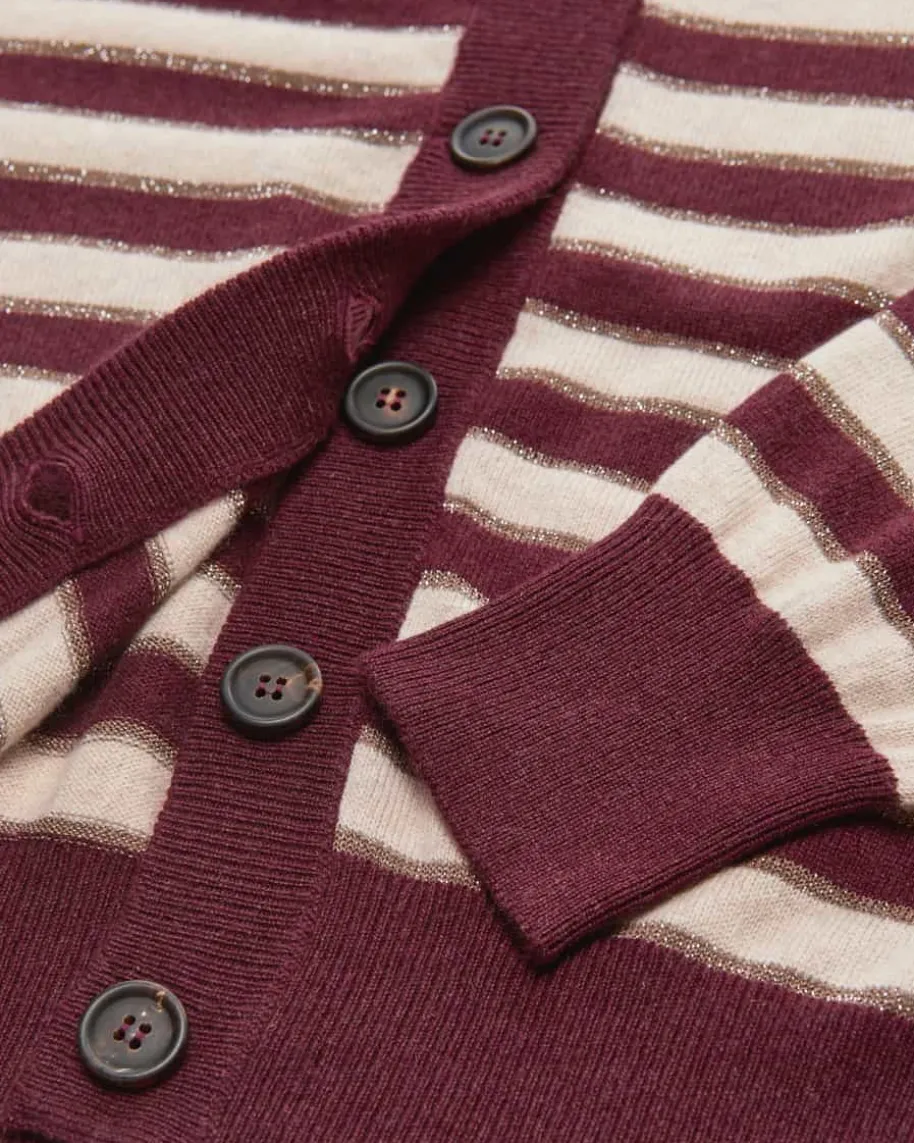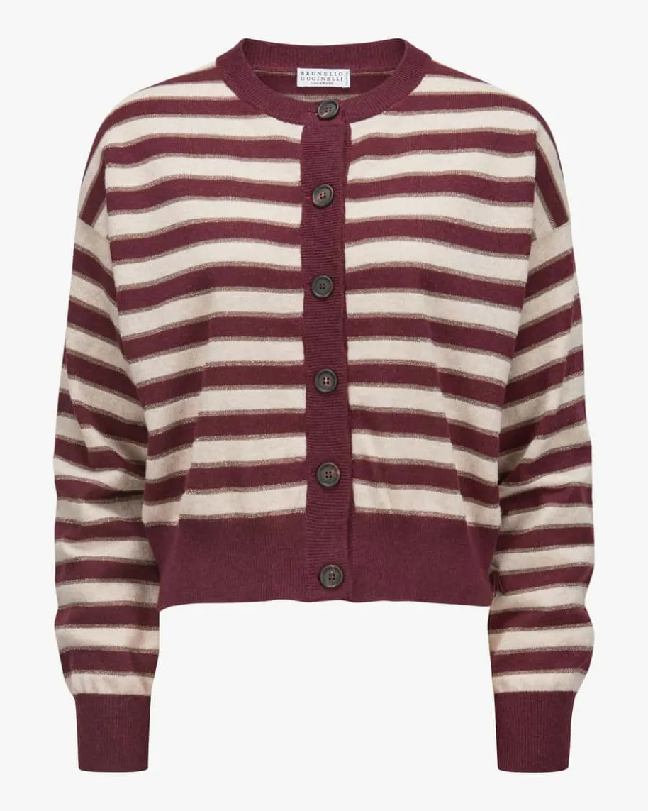 Cashmere-Strickjacke für Damen von Brunello Cucinelli in Bordeaux, Beige undGold. Das Modell präsentiert sich mit klassischem Streifenmuster in Wine- undBeige-Nuancen, während die eingearbeiteten Glitzerfasern in changierender Optikeinen modischen Look kreieren. Die leichte und weiche Cashmere-Verarbeitungsorgt für angenehme Tragemomente und rundet den Style harmonisch ab.