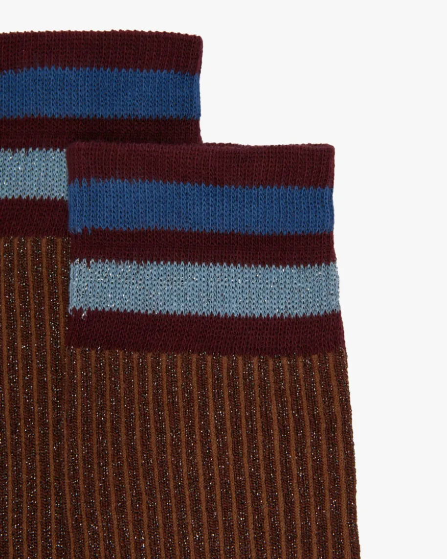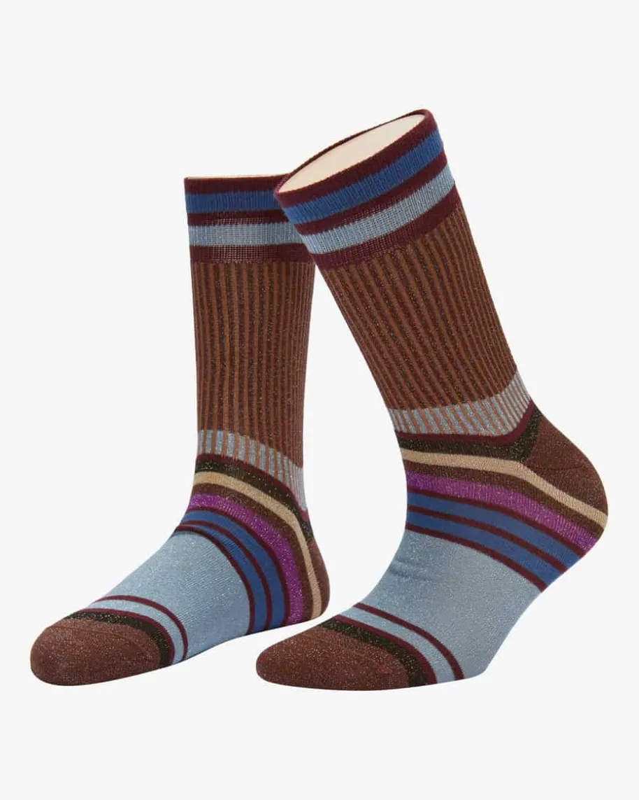 Chapo Strümpfe für Damen von Alto in Braun, Hellblau und Bordeaux. Made in Italy- 1923 gegründet, zeichnet das Unternehmen die Verbindung von Tradition undExzellenz aus. Die Socke ist nicht nur ein Modeaccessoire, sondern interpretiertden Stil und die Persönlichkeit des Trägers. Auch dieses elastische Modellbegeistert dank changierenden Glitzerfasern und Streifenmuster in modischerAufmachung.