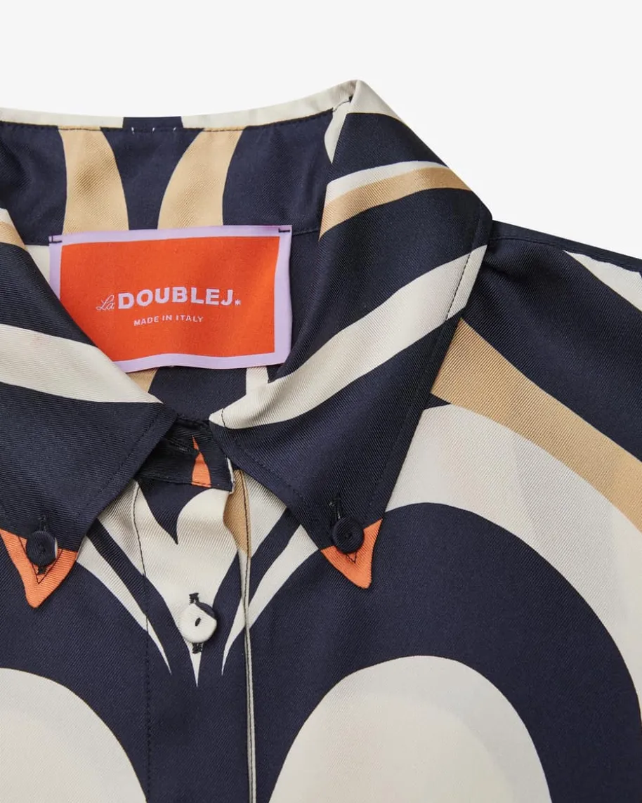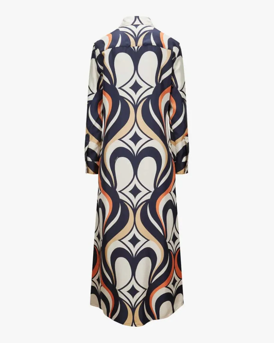 Chemise Swing Seidenkleid für Damen von La DoubleJ in Navy, Beige und Orange.Das Modell präsentiert sich dank der klassischen Passform und in femininerAufmachung, während der kreative Ornament-Print ein modisches Gesamtbild mitSinn für Stil kreiert. Die hochwertige Seiden-Qualität in Twill-Verarbeitungsorgt für angenehmen Tragekomfort und schafft eine edel fließende Optik.