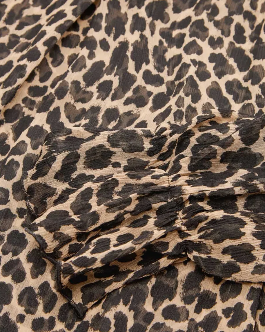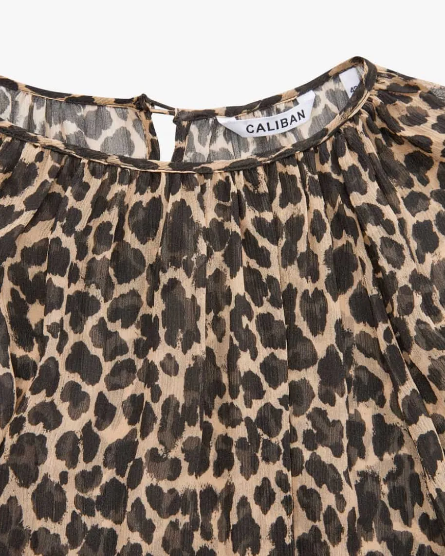 Chiffonbluse für Damen von Caliban in Beige und Schwarz. Das Modell begeistertmit modernem Leo-Print auf semi-transparentem Chiffon. Die lockere Passform mitgerüschten Ärmelenden rundet den femininen Style harmonisch ab.