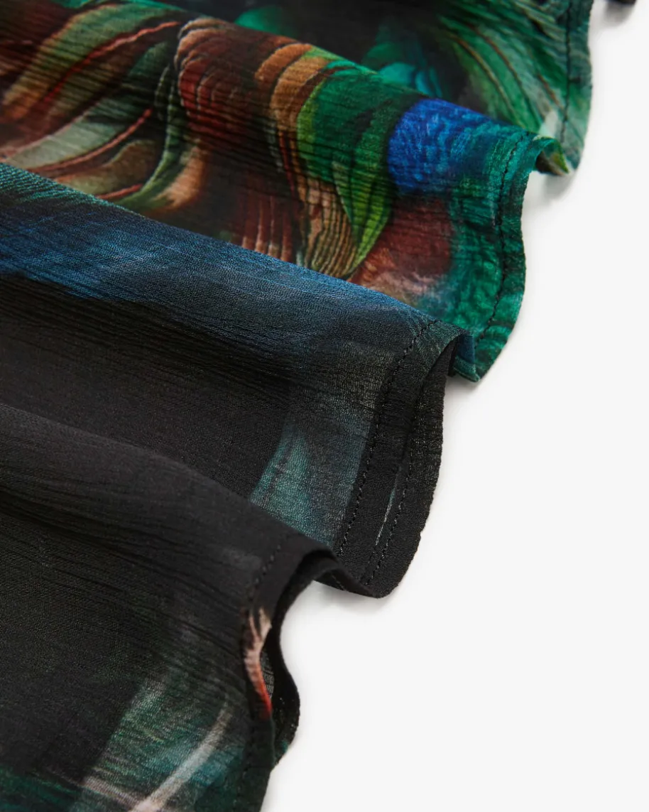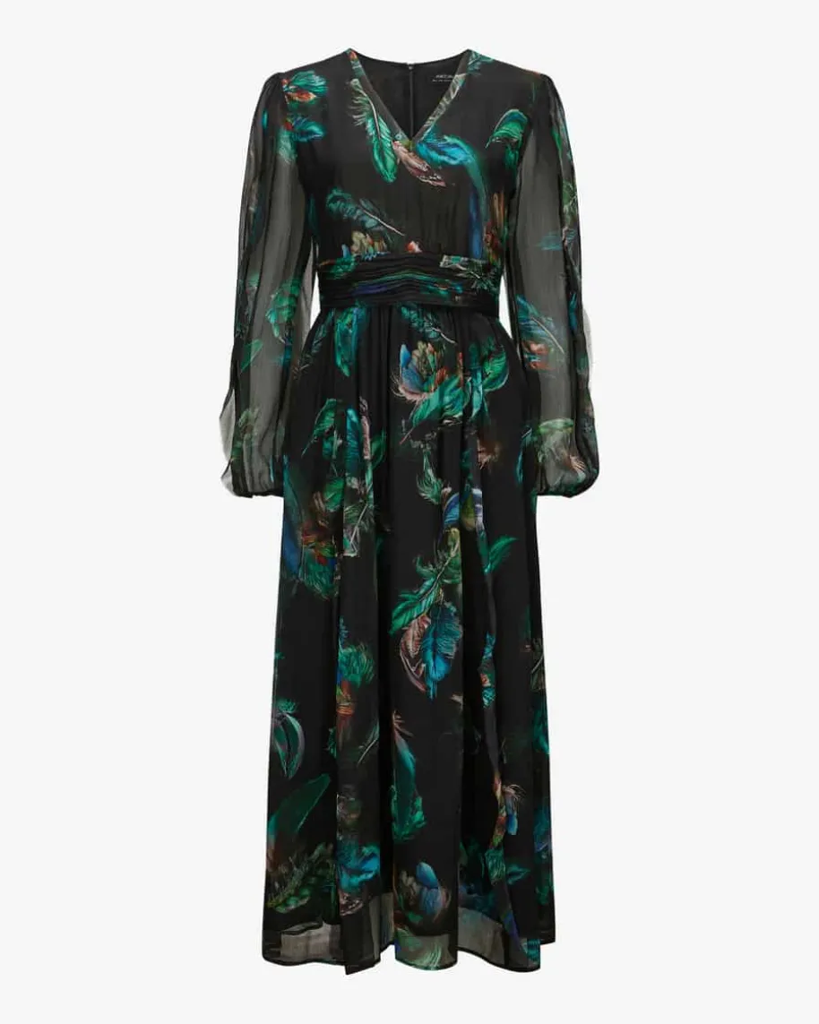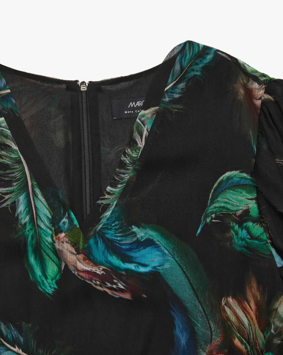 Chiffonkleid für Damen von Marc Cain in Schwarz, Jade und Blau. KombistarkeDesigns mit hohem Qualitätsanspruch – bekannt für Prints & Strick. Auch diesestaillierte Modell in semi-transparenter Aufmachung überzeugt mit femininerSilhouette, während das romantische Feder-Design den Gesamtlook gekonntvollendet.