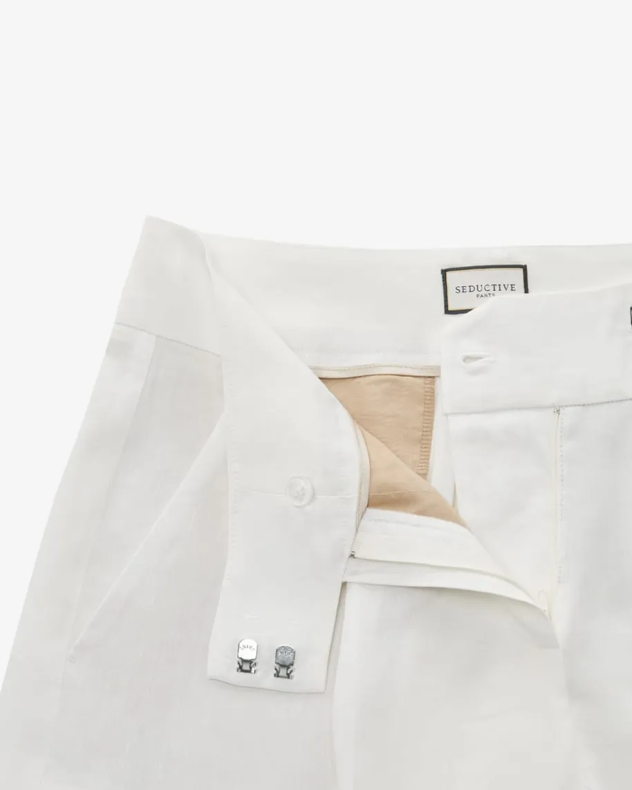 Chrissy Hose für Damen von Seductive in Weiß. Das Modell aus leichtem,semitransparentem Leinen-Mix präsentiert sich mit weiter Passform imMarlenehosen-Stil und avanciert so zum perfekten Begleiter für elegante Outfits.