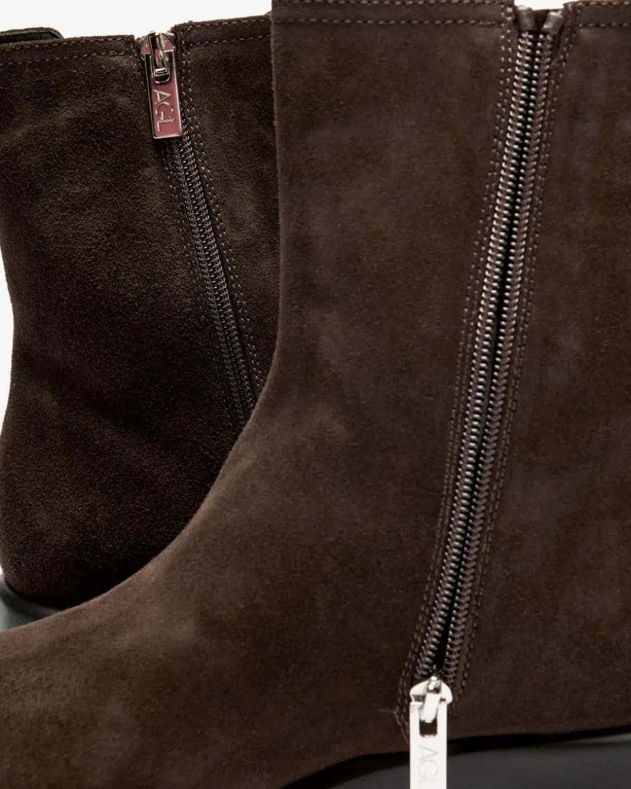 Chunky Beat Chelsea Boots für Damen von AGL in Dunkelbraun. Das Modellpräsentiert sich dank der hochwertigen Veloursleder-Aufmachung mit edler Optik,während die markante Profilsohle modische Akzente setzt. Der elastische Einsatzauf der Schaft-Außenseite rundet den Look gekonnt ab.