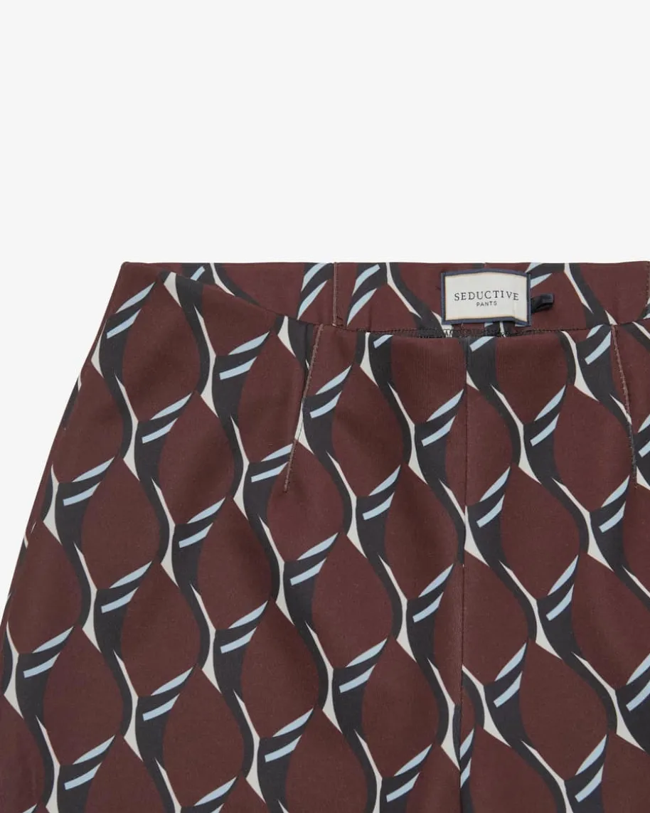 Cindy 7/8-Hose für Damen von Seductive in Bordeaux, Hellblau und Schwarz. DasLabel steht seit 2007 für luxuriöse Hosen mit femininer Silhouette, zeitlosemDesign und höchster Qualität. Auch dieses verkürzte Modell präsentiert sich inmodischer Aufmachung mit stilvollem grafischem Muster, während die elastischeund changierende Qualität angenehme Tragemomente garantiert.