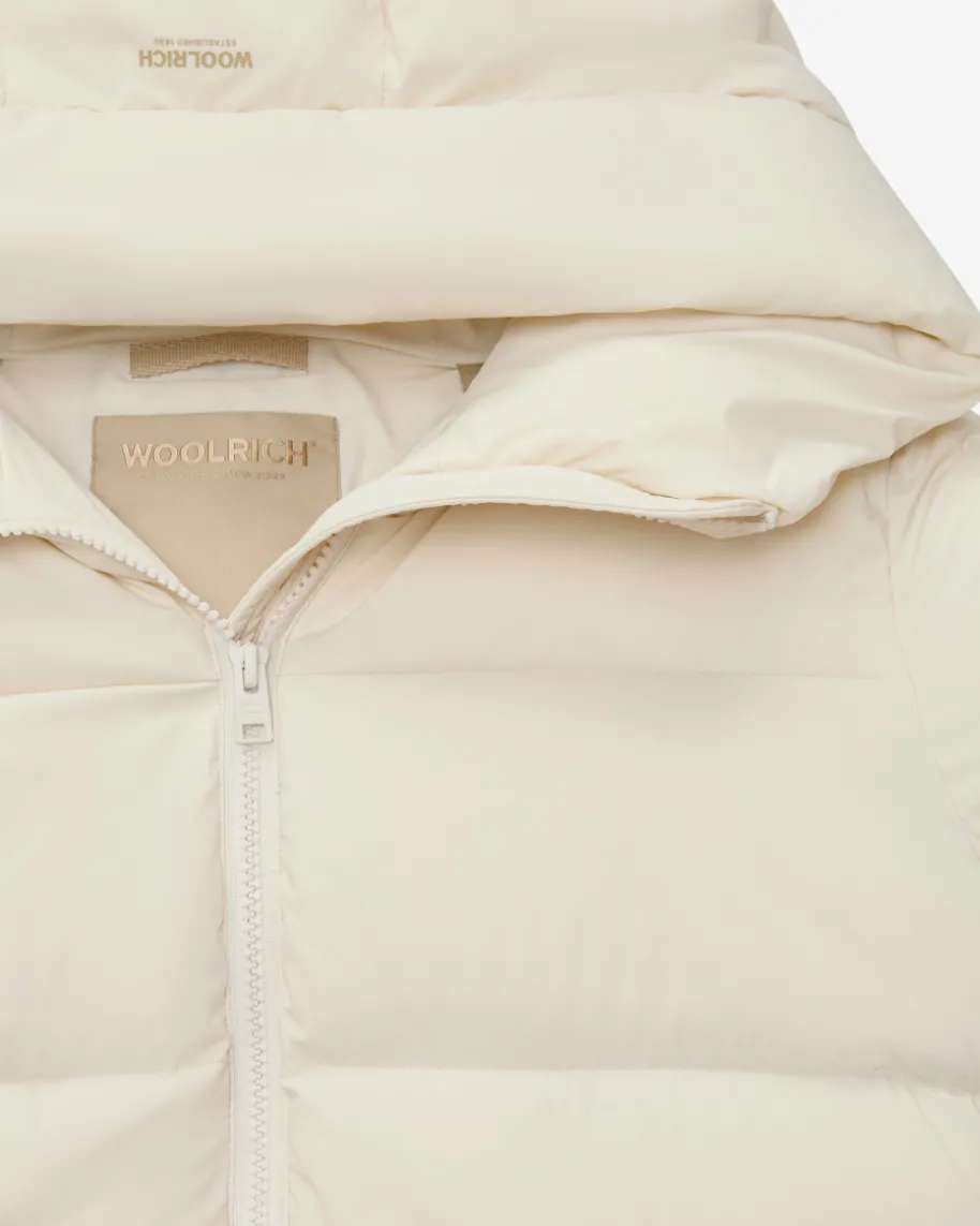 Cloud Madison Daunen-Kurzmantel für Damen von Woolrich in Creme. 1830 von JohnRich in Pennsylvania gegründet, erfreute sich das Label damals schon großerBeliebtheit – vor allem im Outdoor-Bereich. Auch dieses Modell begeistert dankzahlreicher Funktionen sowie der warmen Daunen-Feder-Füllung als hochwertigerWinterbegleiter, während die klassische Steppung sowie die praktischen,innenliegenden Träger das Gesamtbild harmonisch abrunden.