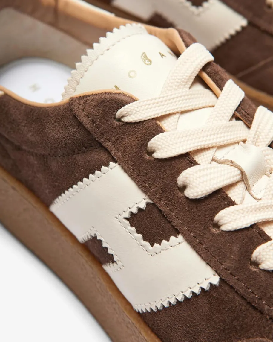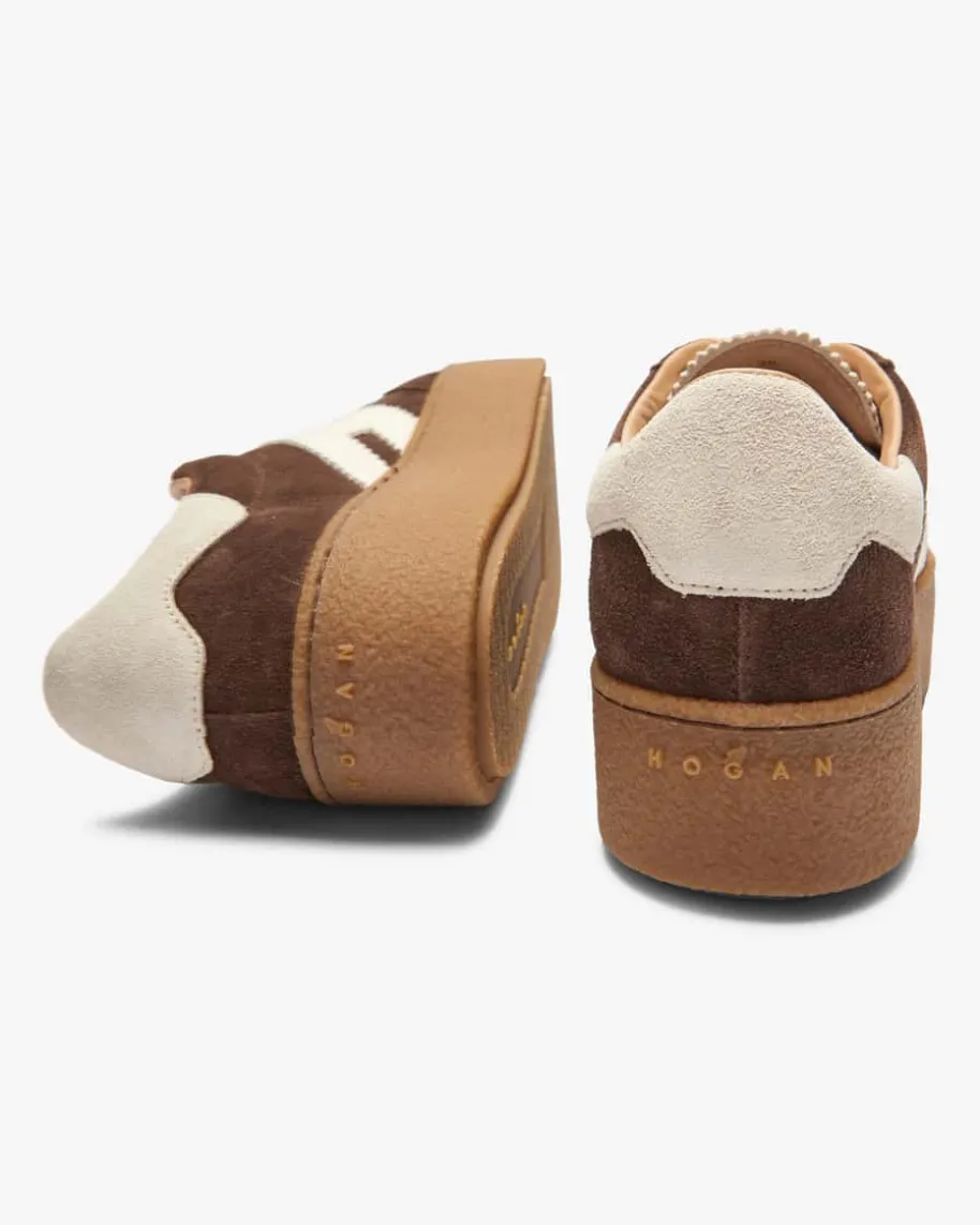 Cool Plateau Sneaker für Damen von Hogan in Braun, Creme und Off-White. Made inItaly – Das Label legt größten Wert auf hochwertige Verarbeitung und begeistertmit luxuriösem Design. Das Modell aus hochwertigem Veloursleder präsentiert sichdank markanter Plateau-Sohle in sportiver Aufmachung, während die farblichabgesetzten Partien einen modischen Retro-Touch verleihen. Zugleich sorgt diegepolsterte Memory Foam-Innensohle für besonders hohen Tragekomfort.