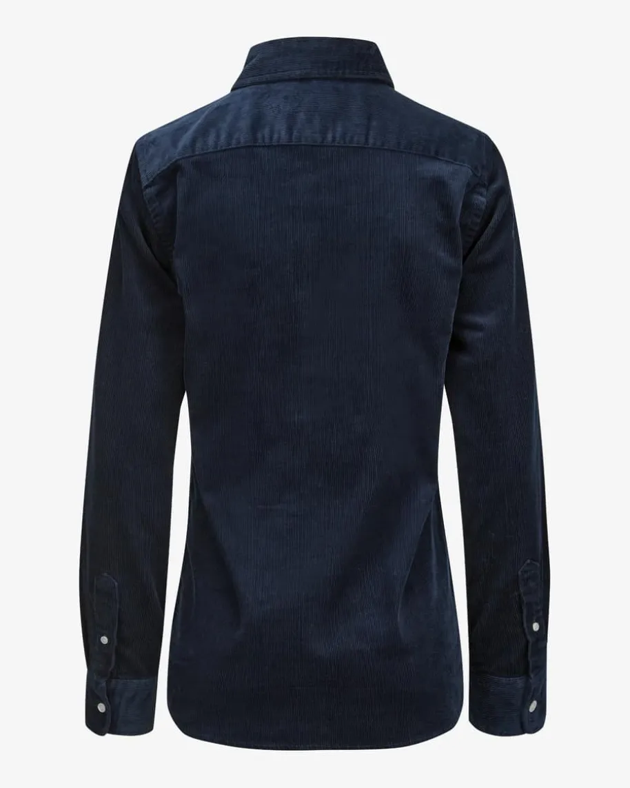 Cord-Hemdbluse Slim Fit für Damen von Polo Ralph Lauren in Navy. Das Modellpräsentiert sich dank der soften Cord-Qualität als moderner Favorit imOvershirt-Stil, welcher durch die kontrastierende Poloreiter-Stickereilabeltypisch inszeniert wird.