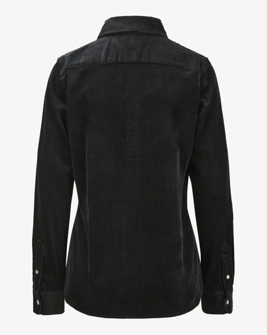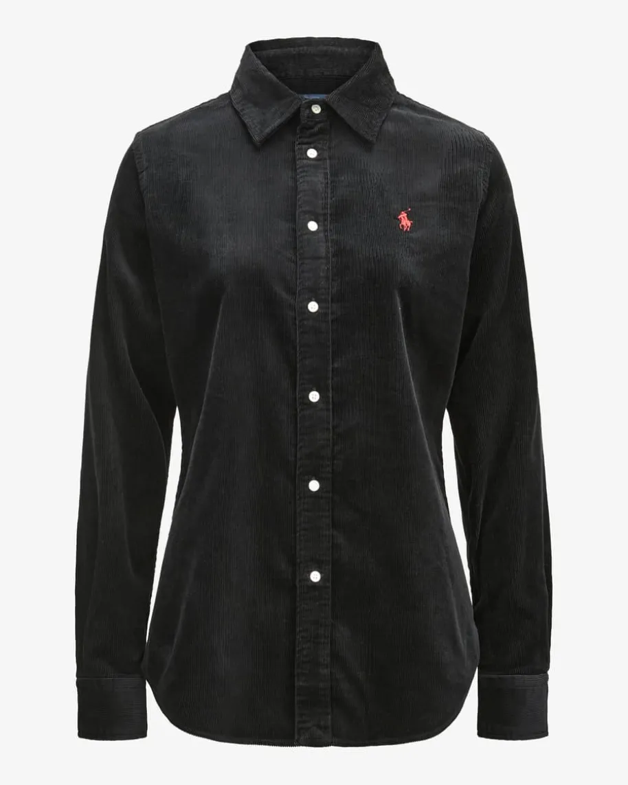 Cord-Hemdbluse Slim Fit für Damen von Polo Ralph Lauren in Schwarz. Das Modellpräsentiert sich dank der soften Cord-Qualität als moderner Favorit imOvershirt-Stil, welcher durch die kontrastierende Poloreiter-Stickereilabeltypisch inszeniert wird.