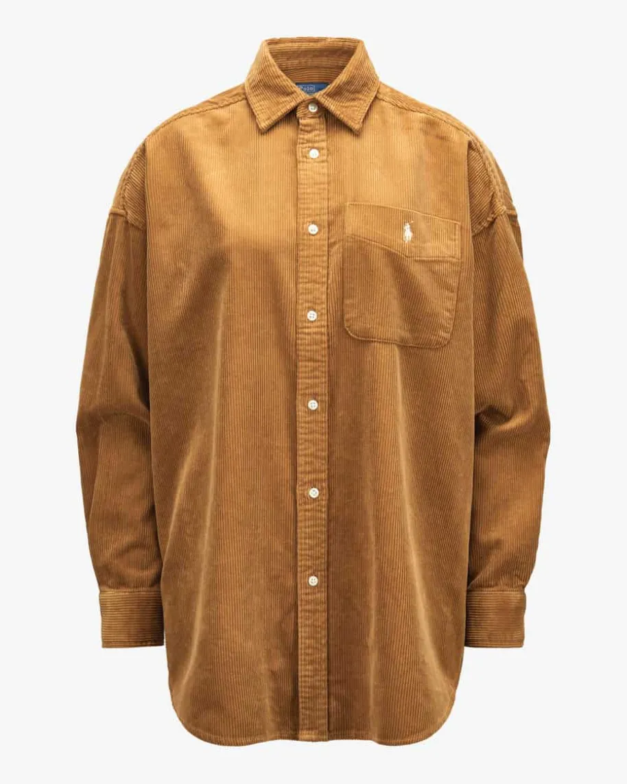 Cord-Overshirt für Damen von Polo Ralph Lauren in Cognac. Das legere Overshirt-Modell überzeugt dank der weiten Schnittführung sowie der changierenden Cord-Qualität als komfortabler und zugleich modischer Favorit, welcher durchlabeltypische Logo-Details abgerundet wird.